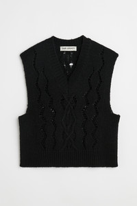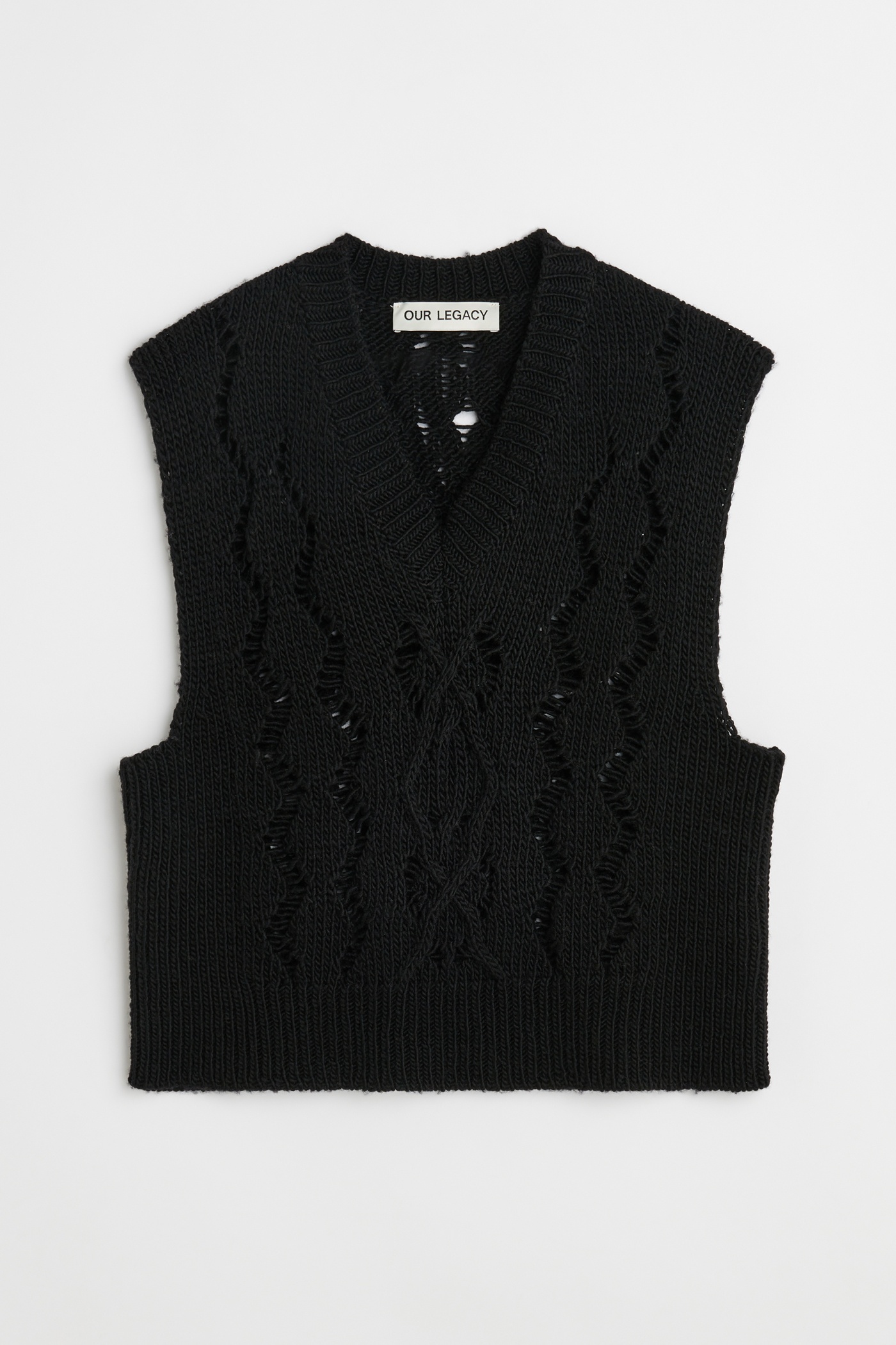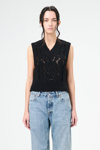 Details · Italian yarn · 100% Lana Wool · V neck collar · Open cable knit · Regular, cropped fit · W4243CBF Description Our Cable Michigan Tank in Black Fisherman Wool. Produced in a Italian lana wool yarn, the sleeveless womens Cable Michigan Tank has a regular, cropped fit and features a v-neck collar and open cable knit. This garment is manufactured using a carefully sourced yarn. The natural characteristics of the yarn, combined with the construction of the knit allows the garment to expand when worn. The garment shall be shaped by its wearer and naturally distress over time to finish the design process. To help keep the integrity of the garment please store the garment folded.