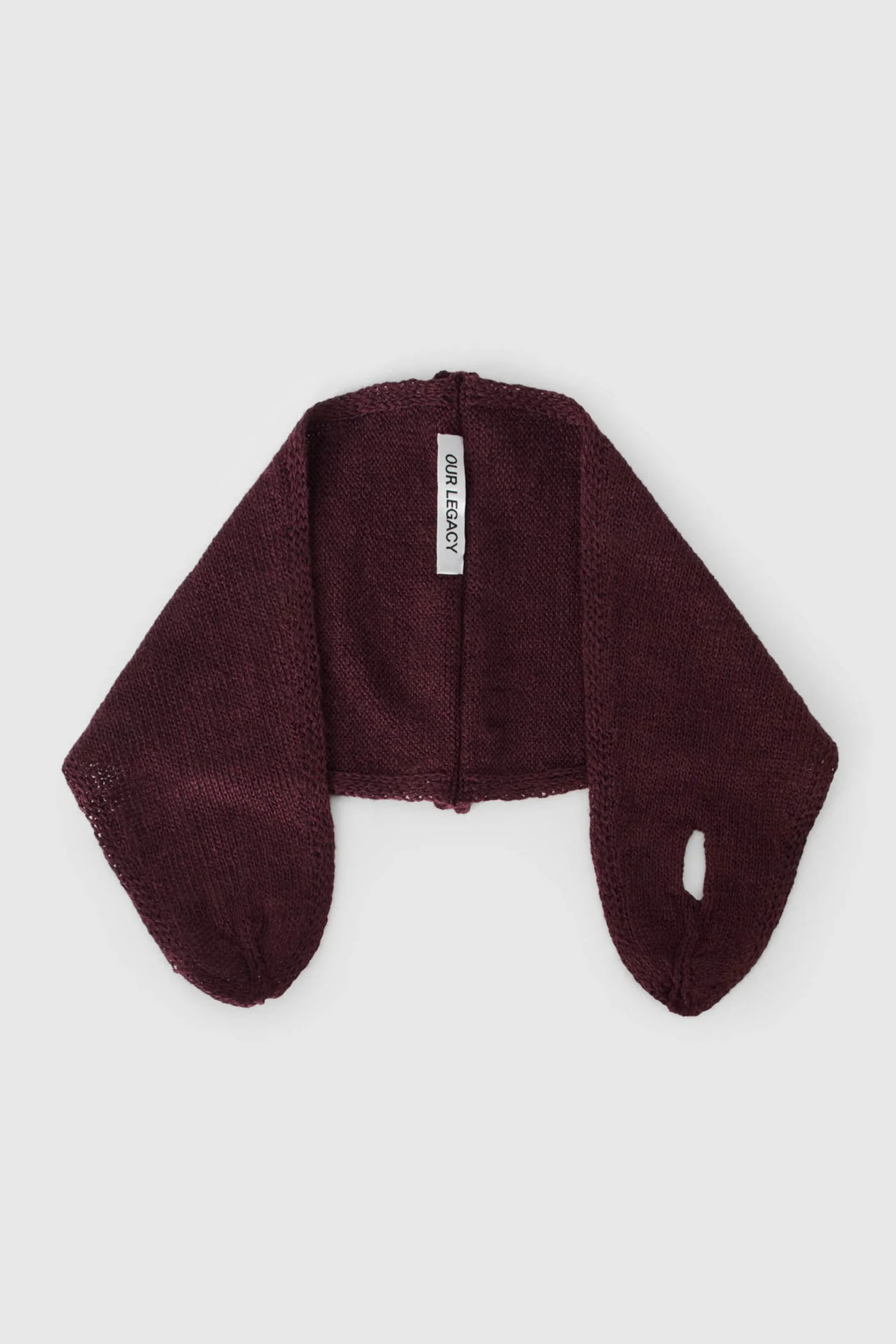 Details · Italian yarn · 75% Linen 25% Organic Cotton · Integrated knitted opening · Full needle edge finishing · Our Legacy tab logo · A2268MCL Description Our Miniature Scarf in Cabernet Cyclone Linen. Knitted from Italian linen and organic cotton yarn. The Miniature Scarf features an integrated knitted opening for looping through itself, full needle edge finishing and a centre seam with the Our Legacy tab logo. This garment is manufactured using a carefully sourced yarn. The natural characteristics of the yarn, combined with the construction of the knit allows the garment to expand when worn. The garment shall be shaped by its wearer and naturally distress over time to finish the design process. To help keep the integrity of the garment please store the garment folded.