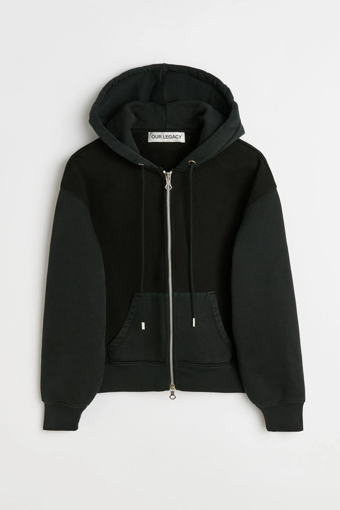 Details · Portuguese heavyweight jersey · 100% Organic Cotton · Piece dyed · Drawstring hood · Two way zip · Kangaroo pocket · Ribbed cuffs and hem · Dropped shoulders · Boxy, cropped fit · W2256MP Description Our Mischief Hood in Pigment Black Hefty Fleece. Produced in a piece dyed heavy weight Portuguese organic cotton jersey the womens Mischief Hood has a boxy, cropped fit and features a drawstring hood, a two way zip, a kangaroo front pocket and ribbed cuffs and hem. This garment is manufactured using carefully sourced material with a unique treatment process that will give each garment an individual shade and appearance. This technique could result in some color bleed onto lighter garments or surfaces. The garment shall be shaped by its wearer and naturally distress over time to finish the design process.