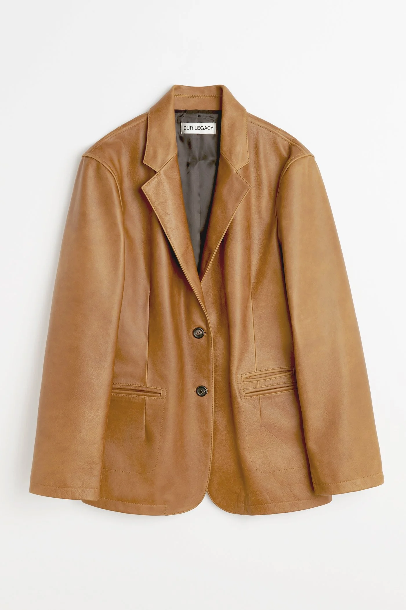 Details · Italian cow leather · Single breasted · Notched lapel · Horn buttons · Welt pockets · Single back vent · Fully lined · Darted for shape · Relaxed, tailored fit · W2259OBS Description Our Opening Blazer in Burnt Sugar Leather. Produced in a smooth Italian cow leather, the womens Opening Blazer has a relaxed, tailored fit and features a notched lapel, three welt pockets, horn buttons and a single back vent. This product is crafted from carefully sourced leather. As a natural material, leather carries subtle traces of the animal's life. These natural imperfections bring a unique character to each product, expressing an original and authentic look. The product shall be shaped by its wearer and naturally distress over time to complete the design process.