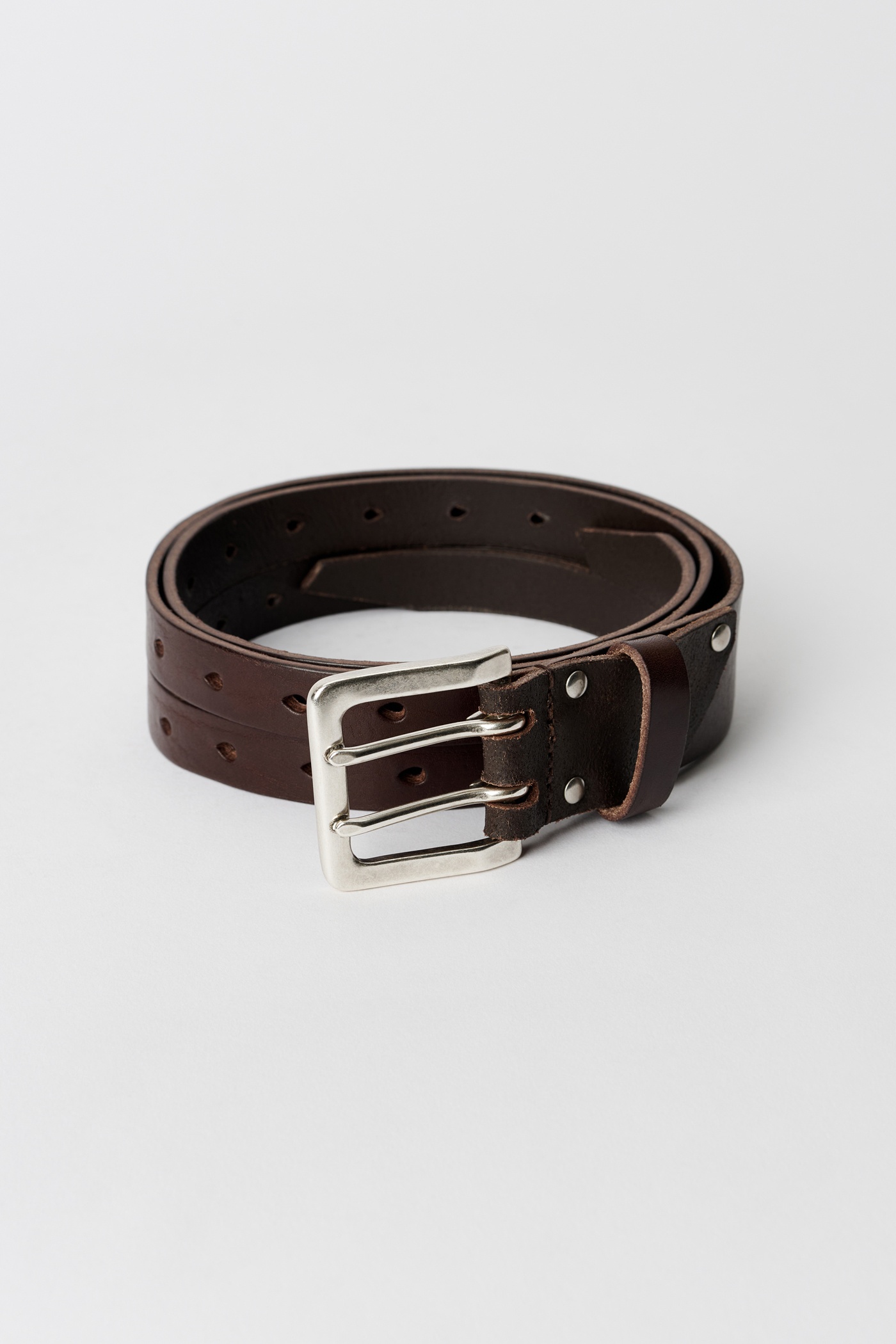 Details · Italian leather · Split asymmetrical construction · Leather panel with studs · Metal double pin buckle closure · 38mm wide · Dust bag · A42484O Description Our Split Belt in Oily Brown Leather. Produced in an Italian cow leather with a split asymmetrical belt construction, the belt is 3.8 cm wide and features a metal double pin buckle closure, leather panel with studs and a dust bag cover. The belt has a width of 3.8 cm and measures 80 cm, 90 cm or 100 cm from the buckle to the third to last hole on the shorter split section. This product is crafted from carefully sourced leather. As a natural material, leather carries subtle traces of the animal's life. These natural imperfections bring a unique character to each product, expressing an original and authentic look. The product shall be shaped by its wearer and naturally distress over time to complete the design process.
