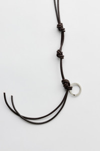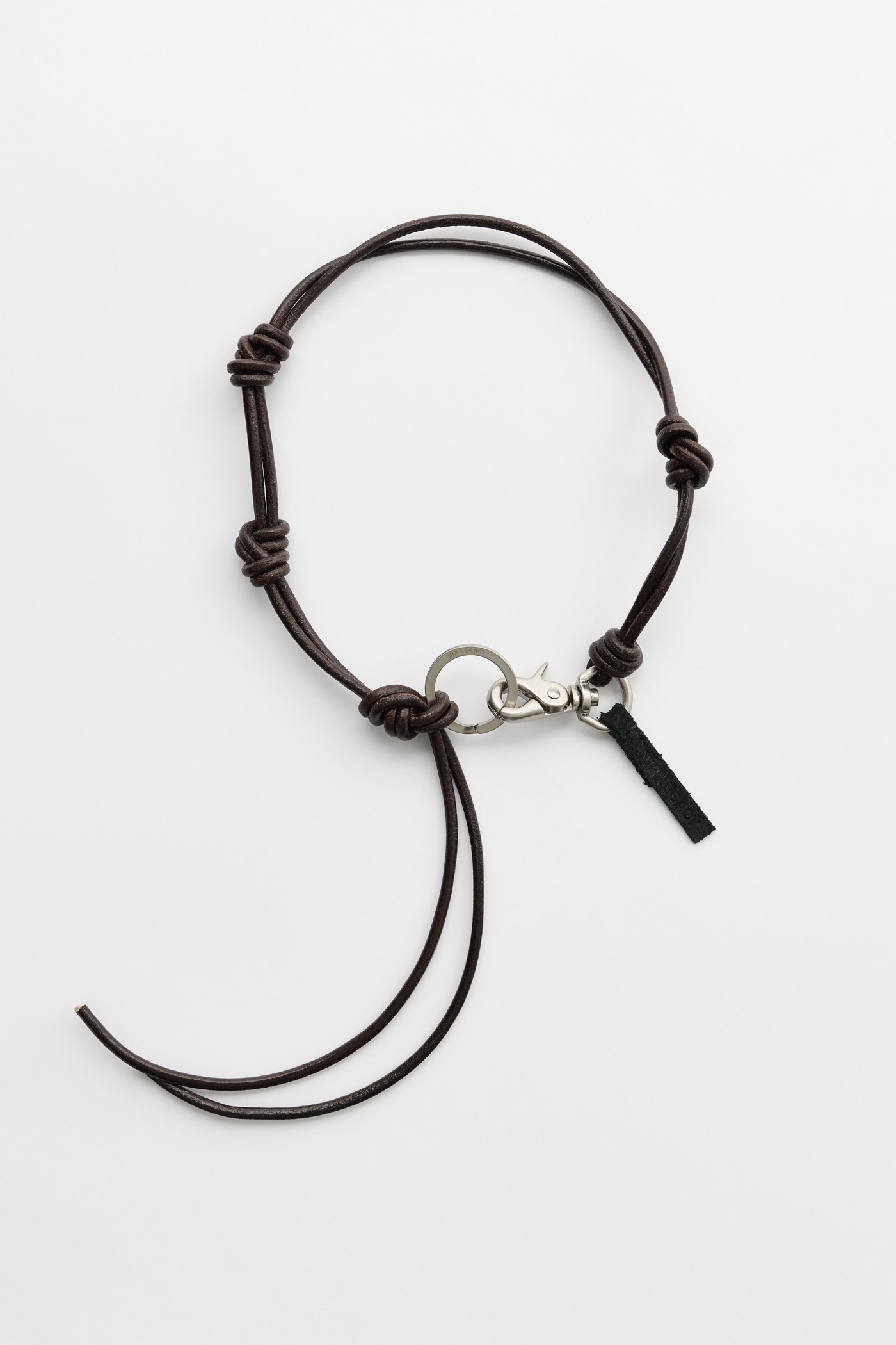 Details · Made in Portugal · Key chain · Italian leather · Chunky noted cord · Japanese metal hardware · W-ring with engraved OUR LEGACY logo · Hand stitched leather tab · Length 40cm · A4248ULD Description Our Udon Ladon in Dark Brown Leather. Produced in a knotted Italian leather cord the Udon Ladon is a chunkier version of our Ladon and features a metal clasp and engraved w-ring. The Ladon is 40 cm in length. This product is crafted from leather sourced with care. Leather, being a naturally derived material, carries with it the subtle imprints of the animal's life, including wrinkles, veins, scars, and stretch marks. These natural imperfections bestow a unique character upon each product, lending it a valuable and authentic look. The article shall be shaped by its wearer and naturally distress over time to finish the design process.