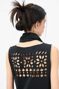 Details · Portuguese fabric · 100% Cotton · Laser cut fair isle pattern on back · Front and back pinch crease details · Raw edge finish · Relaxed lounge fit · W4256LC Description Our Lounge Top in Cut Fairisle Ink Band Jersey. Produced in Portuguese cotton, the women's Lounge Top has interesting construction details and features a laser cut treatment on the back which exposes the wearer's skin. The front and back feature a pinch crease that folds the top of armhole inwards. The back laser cut detail showcases a fair isle pattern taking inspiration from traditional knitwear sweaters, with raw edges that roll to give the detail a worn-out look. This garment is manufactured using carefully sourced material with a unique treatment process that will give each garment an individual shade and appearance. This technique could result in some color bleed onto lighter garments or surfaces. The garment shall be shaped by its wearer and naturally distress over time to finish the design process.