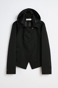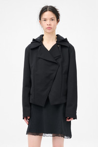 Details · Italian fabric · 53% Polyamide 47% Virgin wool · Detachable hood · Darted for shape · Two front welt pockets · Horn buttons · Button cuffs · Fully lined · W4251VO Description Our Veiled Jacket in Onyx Black Tech Sateen. Produced in an Italian polyamide and virgin wool blend fabric, the women's Veiled Jacket has a sharp, feminine silhouette inspired by transforming masculine military garments into refined suiting pieces. The jacket is darted for shape with a back that is shorter than the front for a defined, sharp look, and features a detachable hood with an extra collar panel for rain protection, front fastening with sew-on snaps and button closure, two front welt pockets, horn buttons, button cuffs, and full lining.