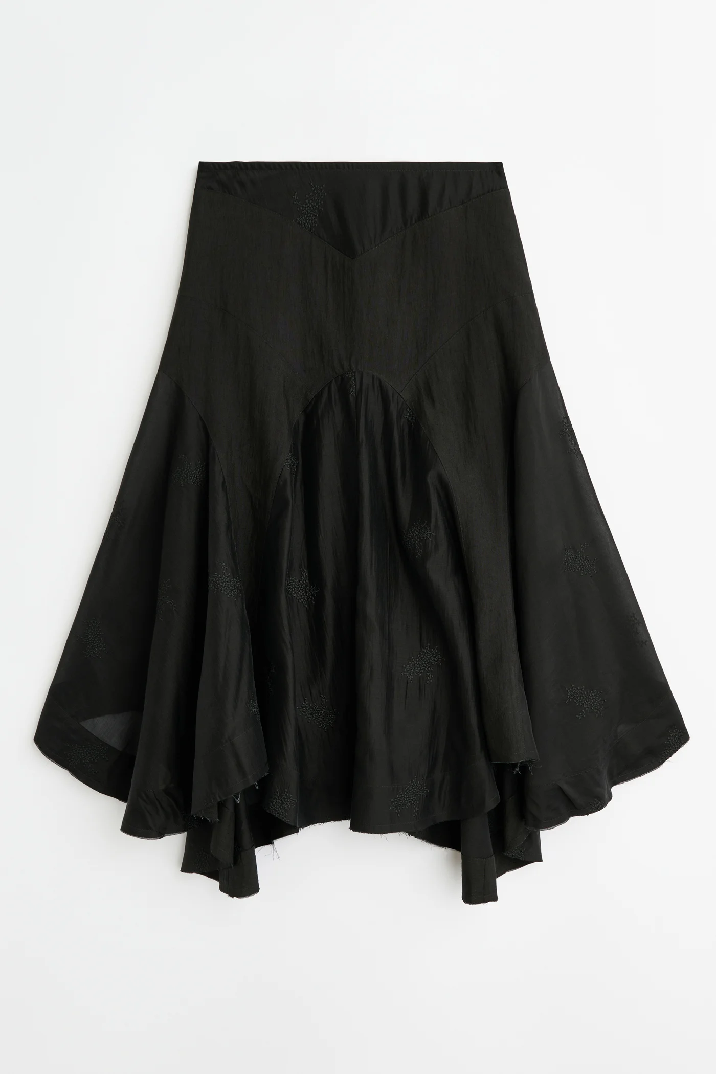 Details · Chinese fabric · 80% Lyocell 20% Polyester · Delicate embroidered floral details · Contrast paneling with sheer draped panels · Hook and bar closure · Invisible zip at back · Raw edge bottom hem · Top waistband with internal webbing to prevent stretching · Slim fit · W2264PNB Description Our Petti Skirt in Noir Bloom Ethereal Veil. Produced in a Chinese lyocell and polyester fabric with delicate embroidered floral details, the women's Petti Skirt has a hip-fitting shape with a frilled bottom, and features contrast paneling with larger sheer draped panels. The skirt is finished with an invisible zip at the back, hook and eye closure, a raw edge hem, and an internal waistband reinforced with webbing to help prevent stretching.