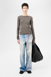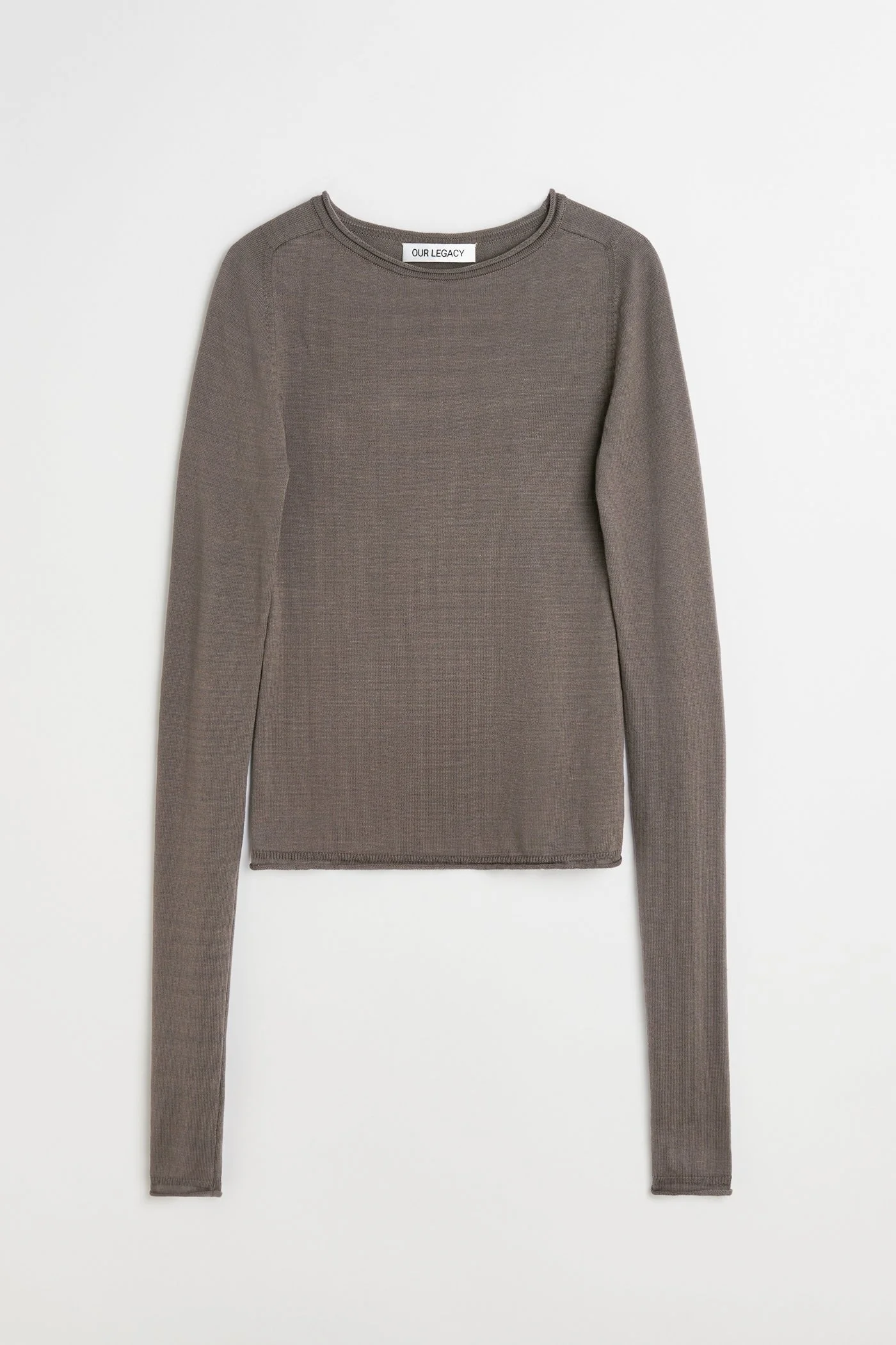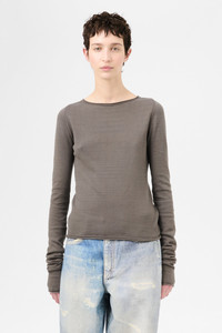 Details · Italian yarn · 100% Organic Cotton · Fine knit · Rolled hems · Saddle sleeves · Slim, elongated fit · W2253RF Description Our Reach Knit in Fog Clean Cotton. Produced in an Italian compact cotton yarn, the womens Reach Knit has a slim fit and features rolled body and sleeve hems, elongated saddle sleeves and a wide and straight neckline. This garment is manufactured using a carefully sourced yarn. The natural characteristics of the yarn, combined with the construction of the knit allows the garment to expand when worn. The garment shall be shaped by its wearer and naturally distress over time to finish the design process. To help keep the integrity of the garment please store the garment folded.