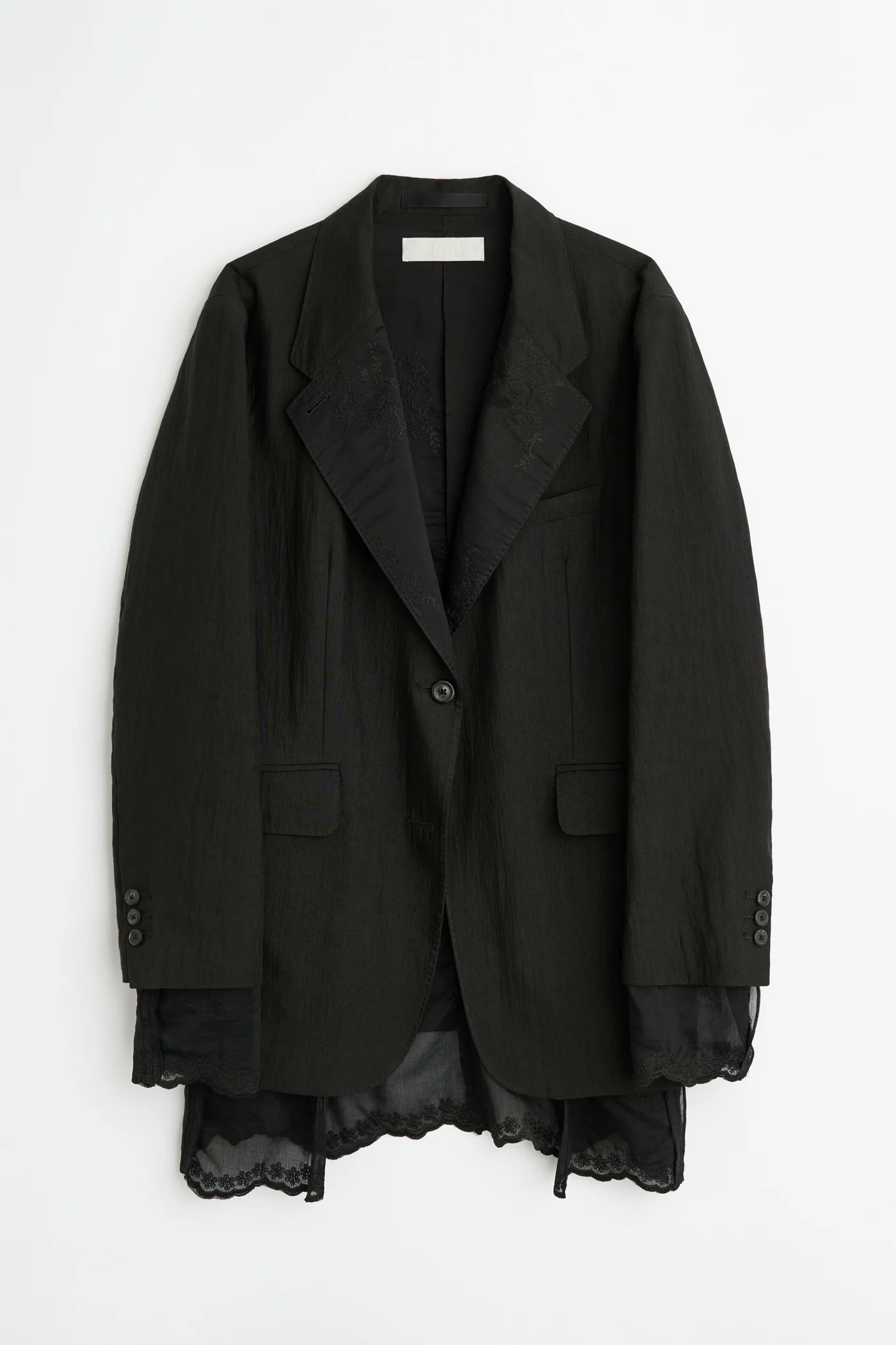Details · Italian fabric · 65% Linen 35% Polyamide · Piece dyed · Horn buttons · Reversible · Single-breasted · Elongated silhouette · Embroidered-edge lining · Lapel can be buttoned up · Unconstructed with a relaxed, collapsing drape · W2260RSB Description Our Reversible Drip Blazer in Soot Black Techflax. Produced in an Italian linen and polyamide blend fabric that has been piece dyed, this slightly oversized single-breasted blazer is unconstructed with a soft, collapsing drape. Designed with elongated proportions, its special lining extends beyond the shell at the body and sleeve hems, revealing a finished embroidered edge. The blazer features horn buttons, a lapel that can be worn buttoned up, and a fully reversible construction. The fabric balances the natural breathability and textured elegance of linen with the durability of polyamide, and is piece dyed for a deep Soot Black tone.