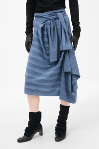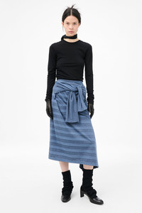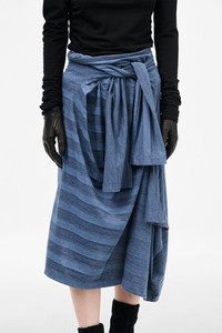 Details · Portuguese jersey · 50% Cotton 50% Polyester · Faded stripe print · Sleeve waist ties · Bound waistline · Asymmetrical hem · Can also be styled as a dress · W2256S7P Description Our Sash Skirt in 70S Jersey Wave Plisse. Produced in a Portuguese cotton and polyester blend fabric with a faded stripe print, the women's Sash Skirt has relaxed asymmetrical silhouette and features a bound waist and sleeve ties around the hip. The Sash Skirt can also be styled as an off the shoulder dress.