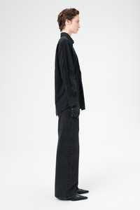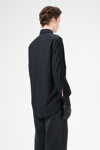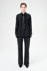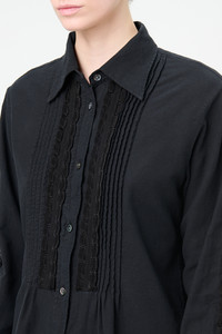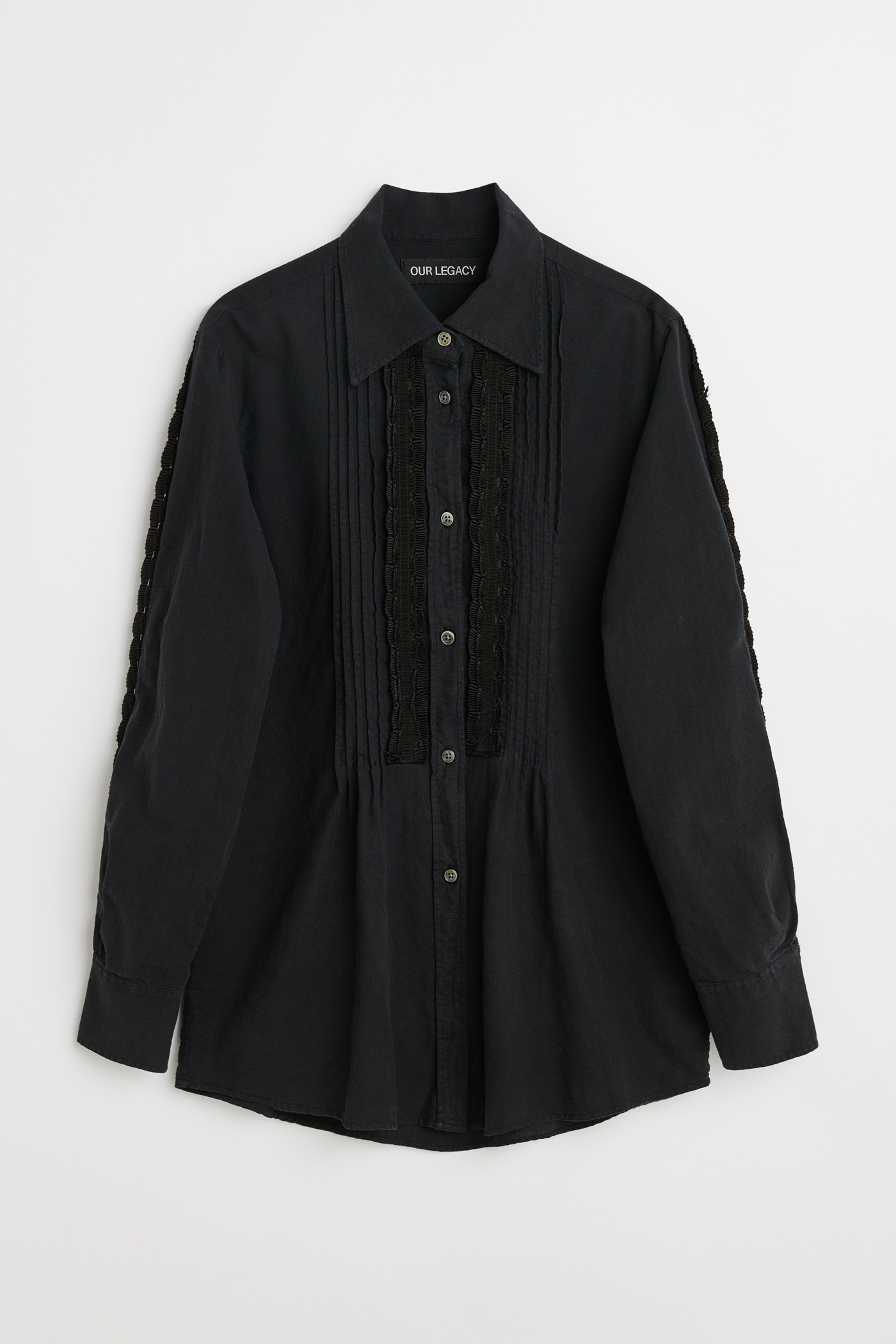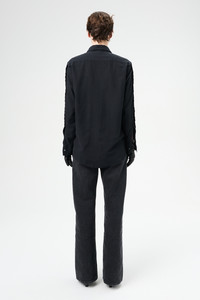 Details · Italian fabric · 55% Linen 45% Cotton · Mother of pearl buttons · Stitched pleat details · Pleated webbing strips on placket and sleeves · Curved hem · Buttoned cuffs · Slightly oversized fit · W4242SBK Description Our Sincere Shirt in Pleated Black Kitchen Weave. Produced in a Italian linen and cotton blend fabric, the womens Sincere Shirt has a slightly oversized cut and features stitched pleats, pleated webbing strips on placket and sleeves, mother of pearl buttons, pleated and webbing details and buttoned cuffs.