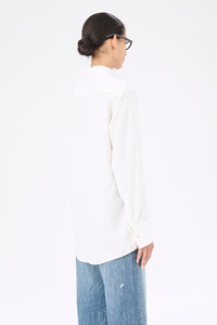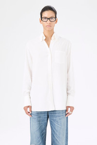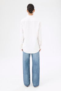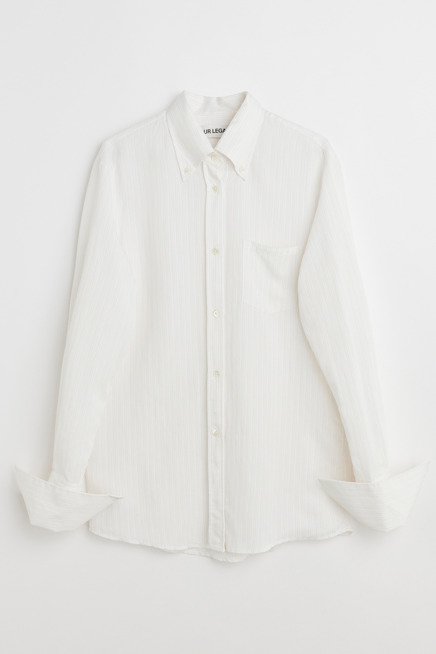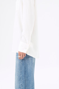Details · Italian striped fabric · 88% Viscose 12% Polyamide · Mother of pearl buttons · Single chest pocket · Curved hem · Cufflink cuff · Slightly oversized fit · W4242SSC Description Our Sincere Shirt in French Stripe Ceremony Viscose. Produced in a striped Italian viscose and polyamide blend fabric, the womens Sincere Shirt has a slightly oversized cut and features mother of pearl buttons, a single chest pocket and cufflink cuffs. This garment is manufactured using a fine and delicate material, carefully sourced for its particular characteristics. The garment shall be shaped by its wearer and naturally distress over time to finish the design process.