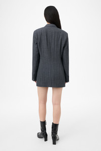 Details · Italian fabric · 88% Virgin Wool 12% Polyamide · Plisse treatment · Peak lapel · Constructed, padded shoulders · Single breasted · Button closure · Jet pockets · Darted for shape · Inner welt pocket · Half lined · Regular, straight fit · W4250CS Description Our Cutaway Blazer in Stone Grey Plisse Wool. Produced in Italian virgin wool and polyamide fabric with plisse treatment, the women's Cutaway Blazer has a regular, straight fit with a cinch at waist and extends past the hip. It features constructed, padded shoulders, a classic peak lapel, single breasted button closure, jet pockets, darted construction for shape, an inner welt pocket, and is half lined. This 'rolling 3' blazer allows for versatile styling - fasten the middle button for a lower break point and deeper opening, or the top button for a higher break point and more closed opening. This garment is crafted from a carefully selected fabric featuring a plisse treatment, chosen for its unique texture and character. This specialized technique creates a permanent crinkled and pleated effect, giving the material a distinctive three-dimensional quality and dynamic visual appeal.