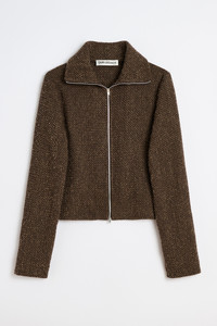 Details · Italian fabric · Textured weave · 40% Recycled Polyester 21% Polyester 27% Recycled Wool · 8% Virgin Wool 2% Polyamide 2% Other Fibres · Lampo two way zip · Funnel neck collar · Flatlock seams · Straight hem · Short boxy fit · W4256SB Description Our Slim Zip Longsleeve in Brown Sparse Buckle Weave. Produced in Italian textured weave fabric crafted from recycled polyester, polyester, recycled wool, virgin wool, polyamide and other fibres. The women's Slim Zip Longsleeve has a short boxy fit and features a Lampo two-way zip, funnel neck collar, flatlock seams and straight hem.