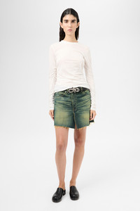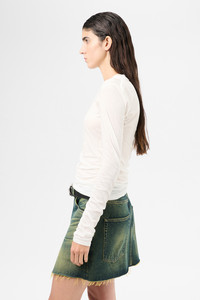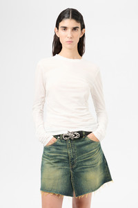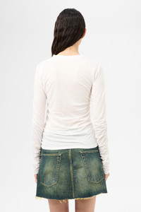 Details · Italian fabric · 100% Cotton · Lightweight fine jersey · Ruched seam details · Folded hems · Elongated sleeves · Overlocked seams · Inverted Our Legacy logo patch · Slim, gathered fit · W2256SW Description Our Strain Slim Longsleeve White Para Cotton. Produced in a lightweight Portuguese fine jersey, the womens Strain Slim Longsleeve has a slim, gathered fit and features ruched details on the shoulders, sleeves and side seams, folded hems and overlocked cuffs.