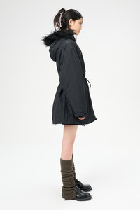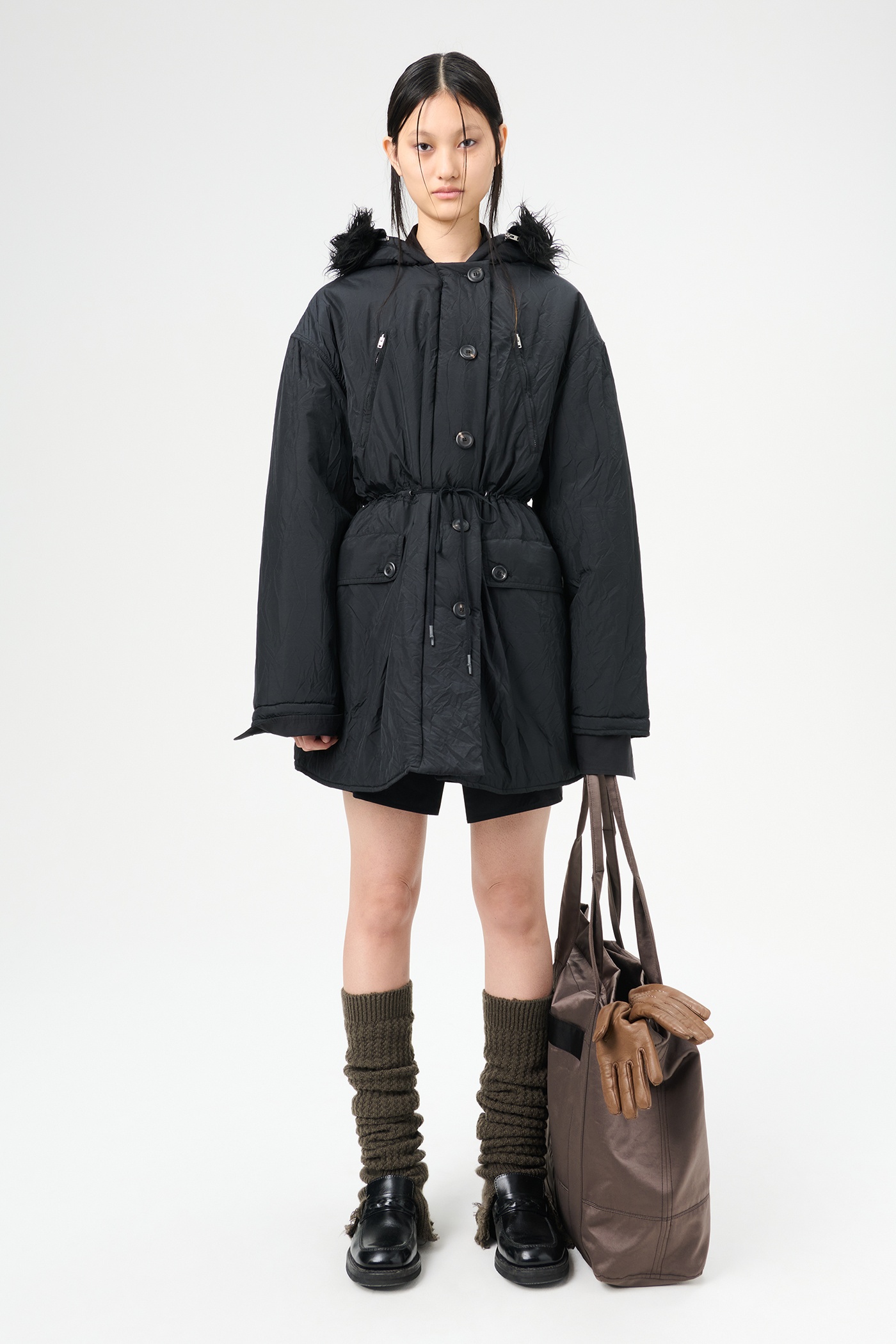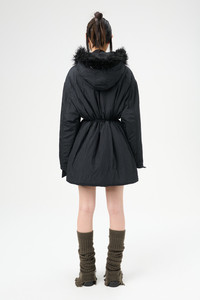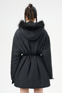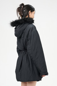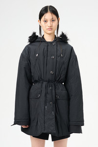 Details · Italian crinkled fabric · 58% Polyamide 42% Polyester · Iridescent solaro effect · Water repellent · Lightly padded · Two angled zip chest pockets · Detachable faux fur collar · Two button flap pockets · Horn button closure · Drawstring waist · Boxy fit · W4241SS Description Our Subtle Parka in Shining Black Crinkle Solaro. Produced in a crinkled Italian polyamide and polyester blend fabric with an iridescent solaro effect, the womens lighlty padded Subtle Parka features a detachable faux fur collar, two angled chest pockets, horn button closure and a drawstring waist.