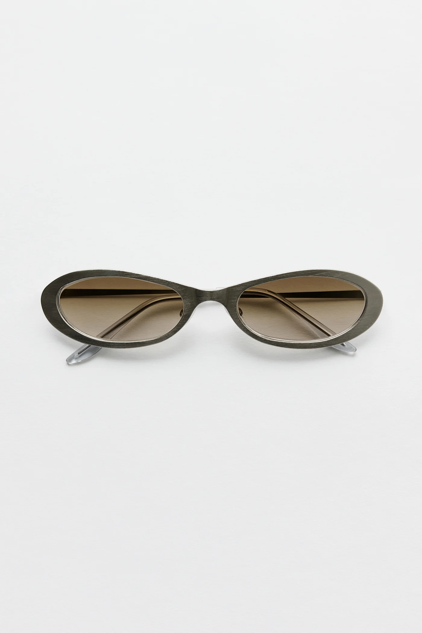 Details · Hand made in Italy · German Silver frame · Matte finish · Temples in bronze · Gradient brown lens · Lenses from Carl Zeiss Vision · Filter category 2 · Anti-scratch coated · Unisex · Travel Case · A2258TI Description Our Tad sunglasses in It Bubble Steel. Handcrafted in Italy with a matte finish German Silver frame and temples in bronze, our unisex eyewear features gradient brown lenses from Carl Zeiss Vision. Frame Width: 140 mm Frame Depth: 34 mm Arm Length: 126 mm