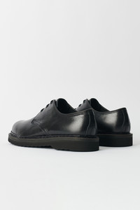 Details · Italian leather · Derby style · Rounded toe · Leather midsole · Vibram cushion sole · Metal Our Legacy rivet on tongue · A2257TSB Description Our Trampler Shoe in Black Supple Cow Hide. Produced in an Italian leather, the derby style Trampler shoe features a rounded toe, a Vibram cushion sole and a metal Our Legacy rivet on the tongue. This product is crafted from carefully sourced leather. As a natural material, leather carries subtle traces of the animal's life. These natural imperfections bring a unique character to each product, expressing an original and authentic look. The product shall be shaped by its wearer and naturally distress over time to complete the design process.