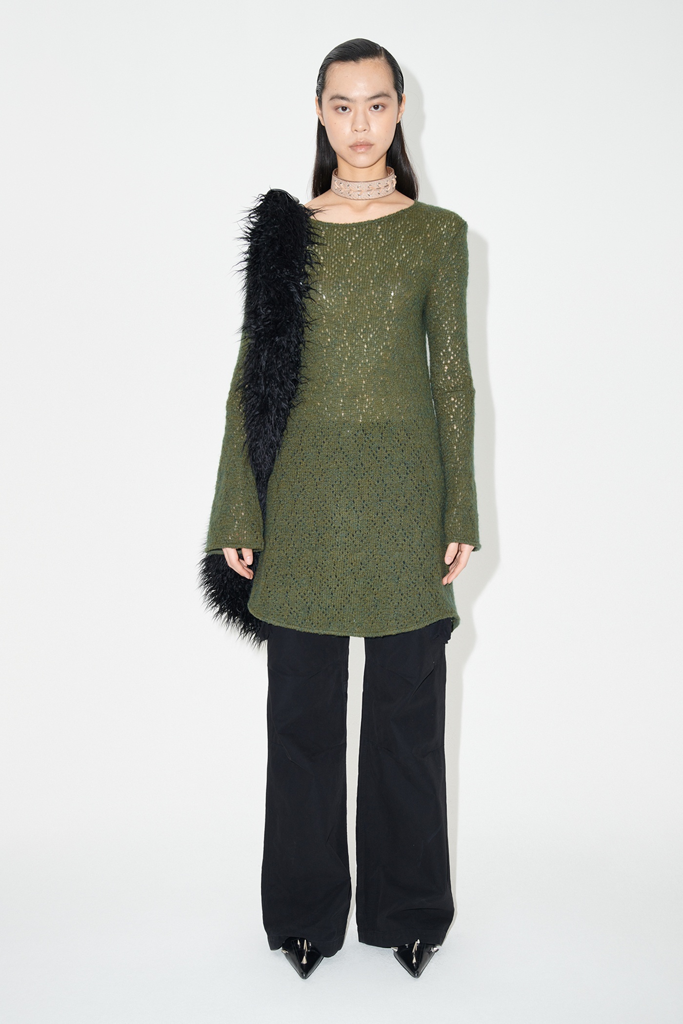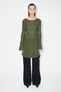 Details · Italian yarn · 40% Acrylic 30% Mohair 30% Polyamide · Sheer crochet fabric · Wide neckline · Elongated body · Darted elbows · W4236TM Description Our Two Face Dress in Moor Green Crochet. Produced in an Italian sheer crochet Acrylic, Mohair and Polyamide blend, the womens Two Face Dress has an elongated fit and features a wide neckline, darted elbows and overlocked raw cuffs and hem. This garment is manufactured using a fine and delicate material, carefully sourced for its particular characteristics. The garment shall be shaped by its wearer and naturally distress over time to finish the design process.