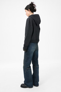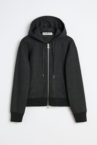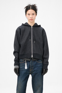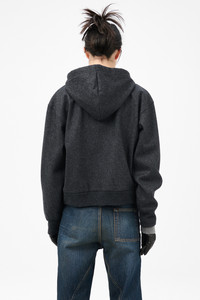 Details · Italian fabric · 43% Cotton 43% Polyester · 13% Polyamide 1% Elastane · Melton jersey · Drawstring hood · Two way zip · Kangaroo pocket · Ribbed cuffs and hem · Dropped shoulders · Boxy, cropped fit · W4256MC Description Our Mischief Hood in Charcoal Elastic Melton. Produced in a Italian melton fabric blend with elastane for comfort and movement, the women's Mischief Hood has a relaxed fit and features a structured hood construction with elastic properties for enhanced flexibility and shape retention.