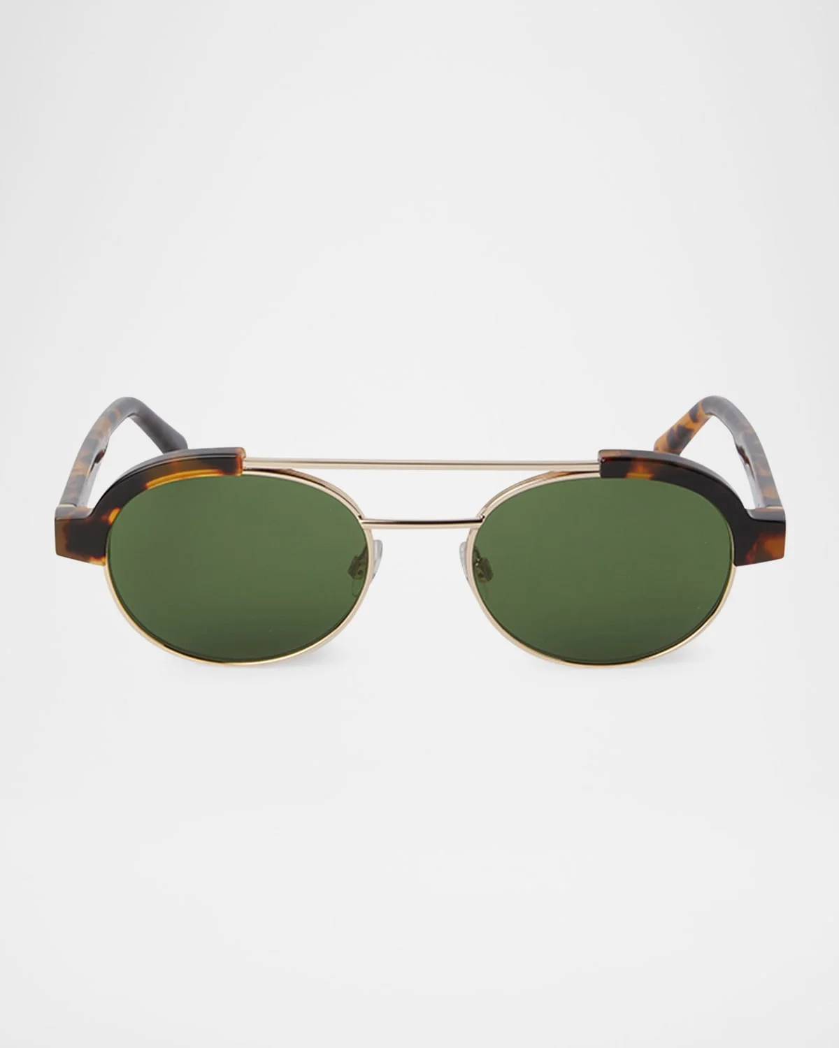 - Palm Angels "Artesia" oval sunglasses in acetate and metal - Eye/bridge/temple (in mm): 52-19-145 - Solid lenses - Adjustable nose pads - Double brow bar - Thin, tapered arms - Logo engraved at temples - Acetate/metal - 100% UVA/UVB protection - Made in Italy - Proposition 65 warning for California residents