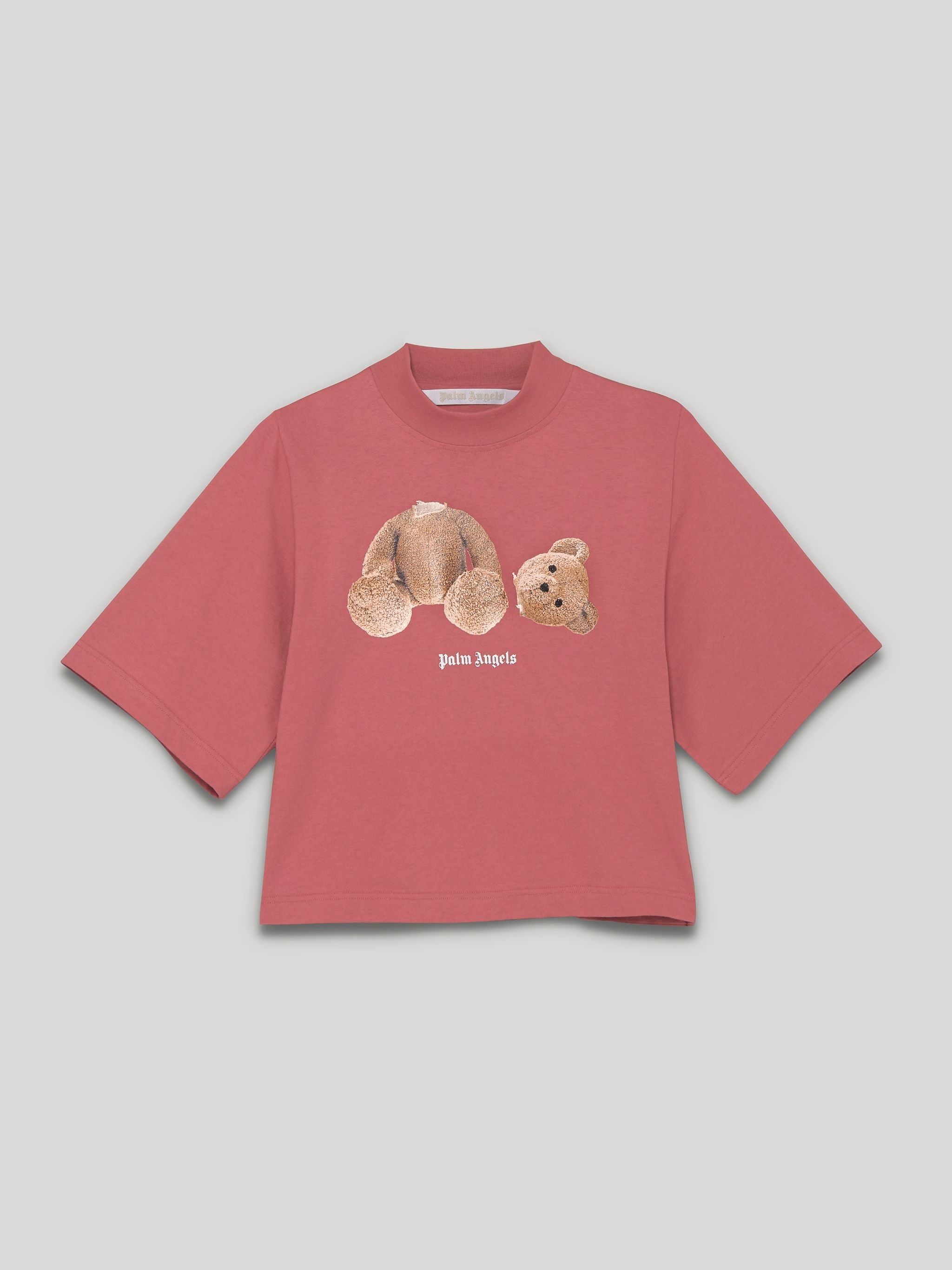 SHORT SLEEVES CROPPED T-SHIRT IN BURGUNDY WITH BEAR GRAPHIC PRINTED AT FRONT. "PALM ANGELS" LOGO PRINTED IN WHITE AT FRONT. RIBBED COLLAR. "PALM ANGELS" GOTHIC LOGO PRINTED AT BACK IN WHITE. MODEL IRENE WEARS SIZE S HEIGHT: 5'.9" (175 CM) BUST: 31" (78 CM) WAIST: 23" (59 CM) HIPS: 35" (88 CM) PRODUCT ID: PWAA020F21JER0042860