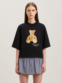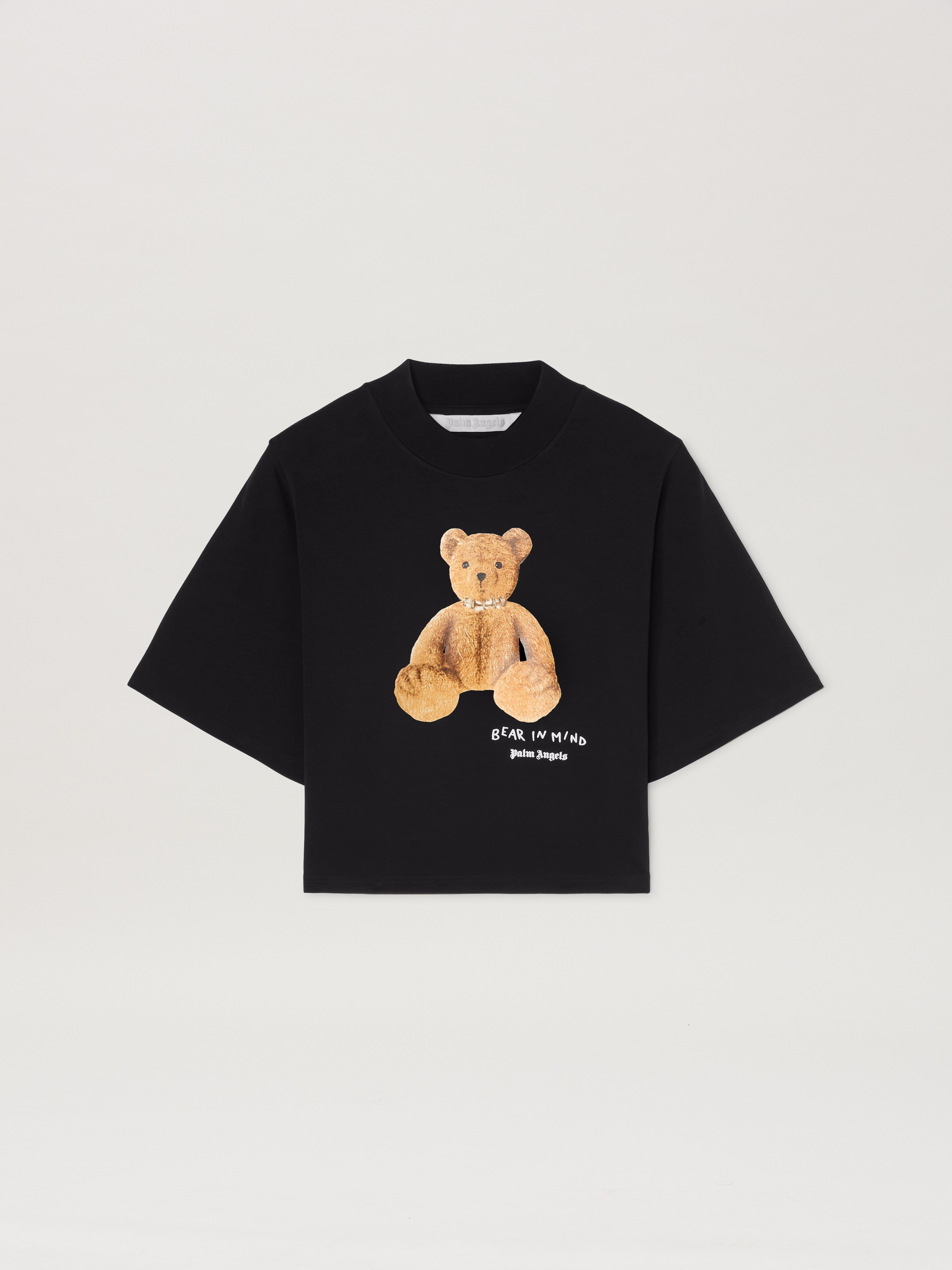 The iconic teddy bear in its punk version returns with new motifs and graphics. Women's black short-sleeved cropped T-shirt featuring glossy screen-printed teddy bear with stapled neck on the front and with Bear in Mind graphic and Palm Angels logo printed in white below. TILDA WEARS SIZE S HEIGHT: 5' 10” (178 CM) BUST: 28” (73 CM) WAIST: 23” (60 CM) HIPS: 35” (89 CM) PRODUCT ID: PWAA020S25JER0051060