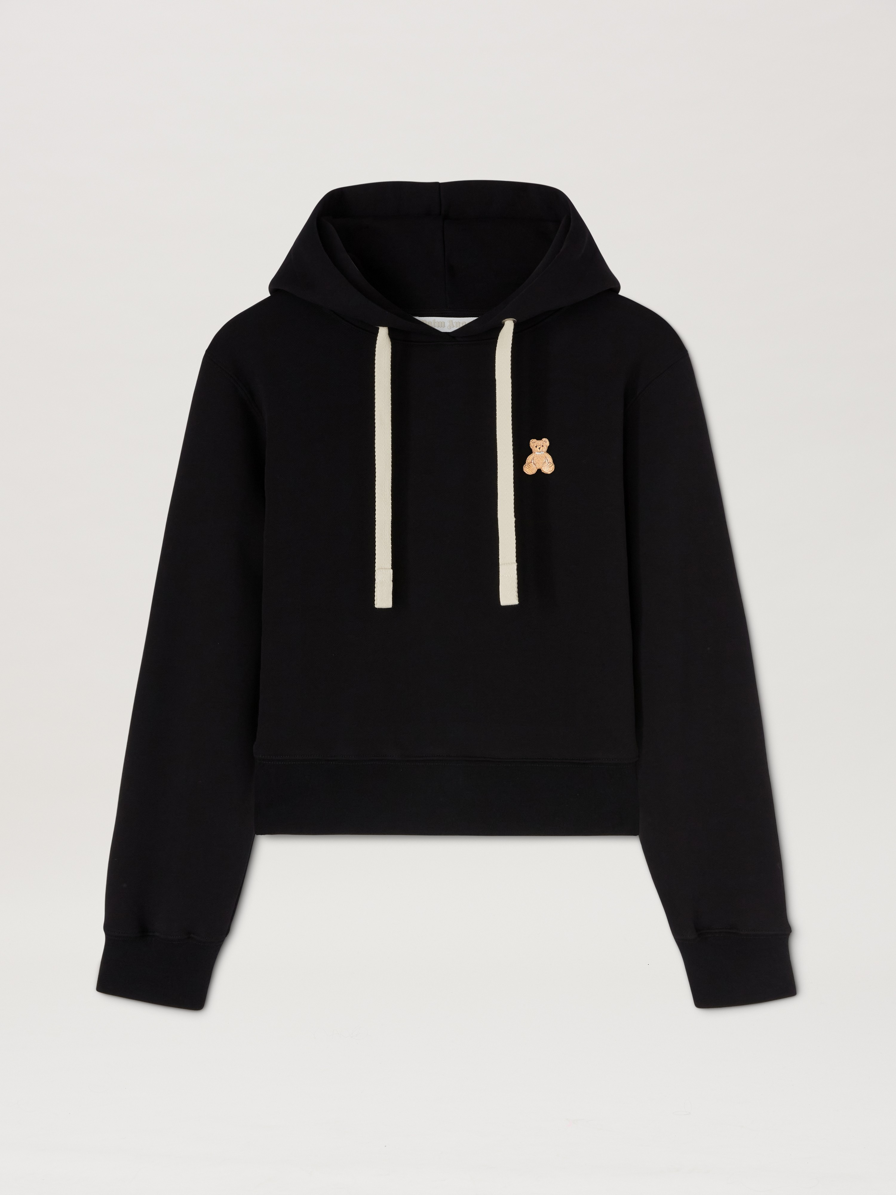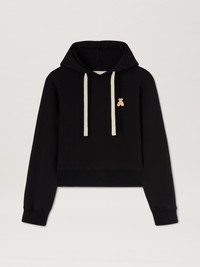 The iconic teddy bear in its punk version returns with new motifs and graphics. Women's black hoodie with small teddy bear patch on the front and big patch of teddy bear with stapled neck on the back and with Bear in Mind graphic and Palm Angels logo printed in white over and below. TILDA WEARS SIZE S HEIGHT: 5' 10” (178 CM) BUST: 28” (73 CM) WAIST: 23” (60 CM) HIPS: 35” (89 CM) PRODUCT ID: PWBB075S25FLE0021060