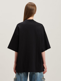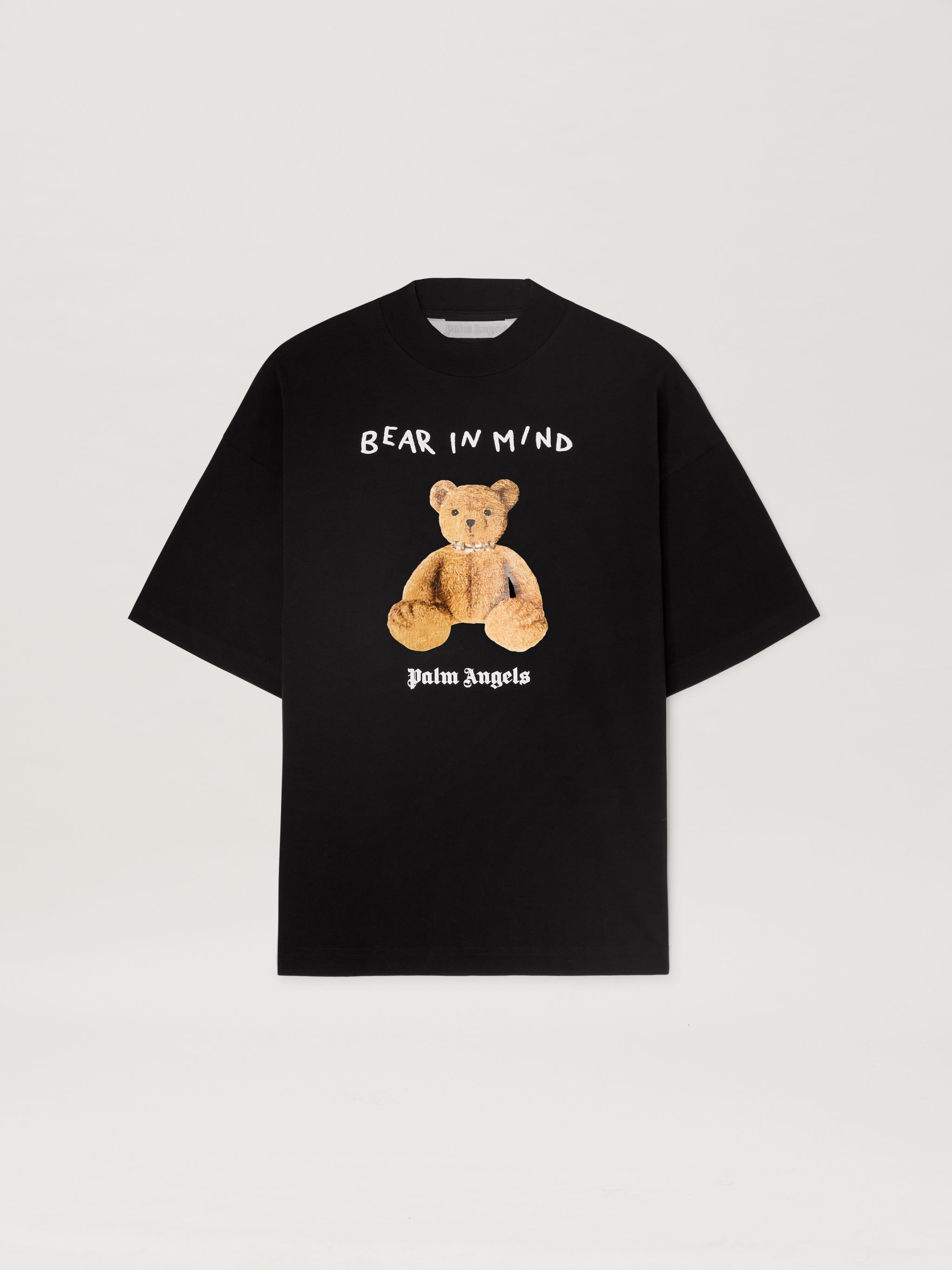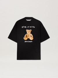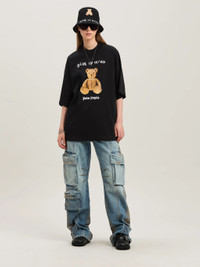 The iconic bear in its punk version is back with new motifs and graphics. Women's black loose short-sleeved T-shirt featuring teddy bear with stapled neck glossy screen-printed on front, Bear in Mind graphic printed in white above and Palm Angels logo printed in white below. TILDA WEARS SIZE S HEIGHT: 5' 10” (178 CM) BUST: 28” (73 CM) WAIST: 23” (60 CM) HIPS: 35” (89 CM) PRODUCT ID: PWAA017S25JER0051060