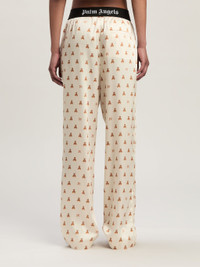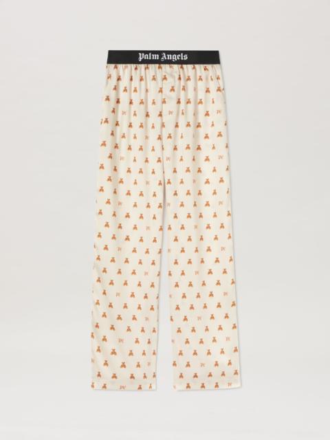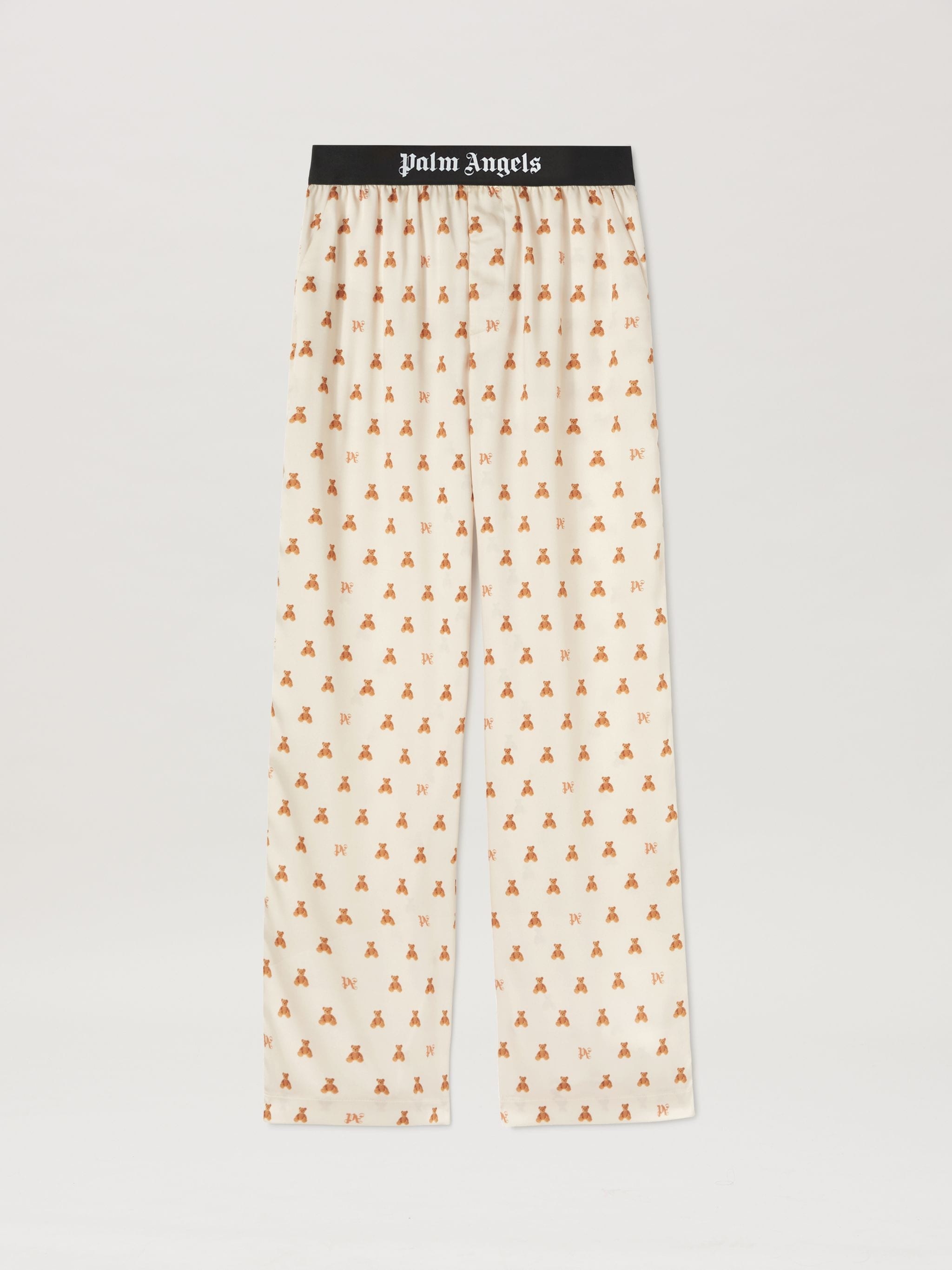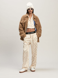 The evolution of an iconic character: the teddy bear is transformed into a pattern that covers shirts, pants and accessories. Women's butter color pajama pants with an all over print of mini bear and golden brown Monogram, and with black elastic waistband with Palm Angels logo in white. LAURE WEARS SIZE 40 HEIGHT: 5' 9" (177 CM) BUST: 30" (78 CM) WAIST: 23" (60 CM) HIPS: 35" (87 CM) PRODUCT ID: PWCA117F24FAB0040460