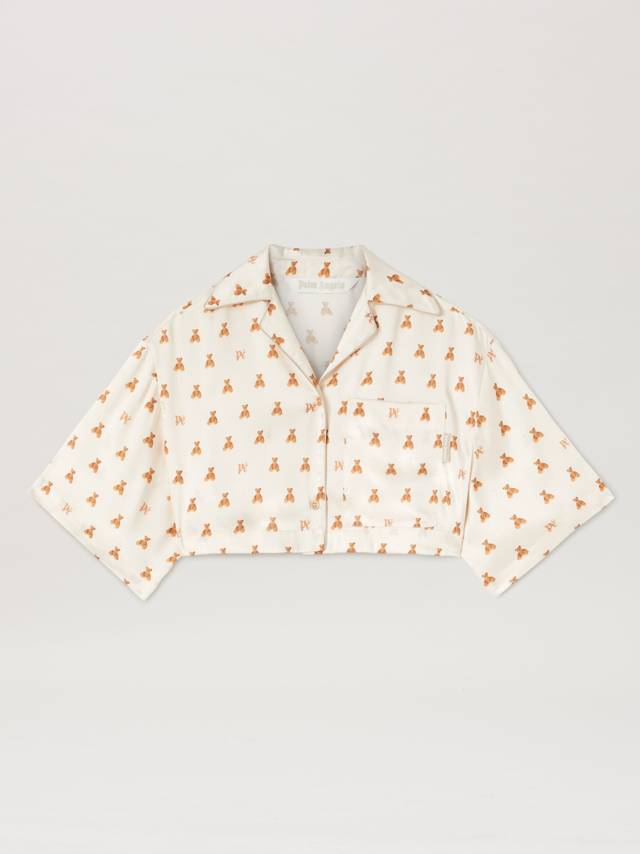 The evolution of an iconic character: the teddy bear is transformed into a pattern that covers shirts, pants and accessories. Women's butter color pajama shirt, cropped and with breast pocket, featuring an all over print of mini bears and golden brown Monogram. LAURE WEARS SIZE 40 HEIGHT: 5' 9" (177 CM) BUST: 30" (78 CM) WAIST: 23" (60 CM) HIPS: 35" (87 CM) PRODUCT ID: PWGG003F24FAB0050460