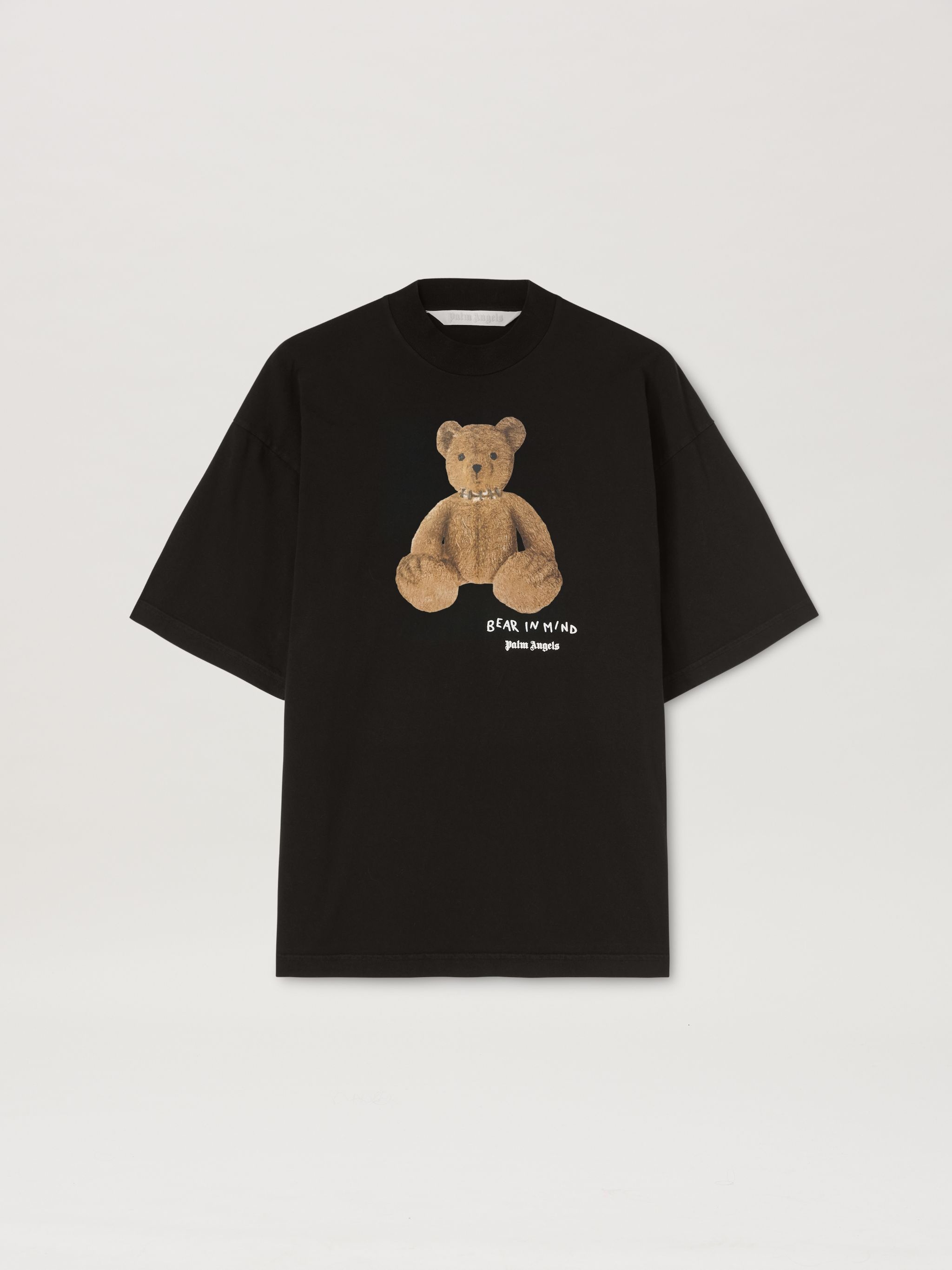 The evolution of a signature character: the teddy bear has an updated status and a matching quote. Women's black, short-sleeved T-shirt with print of teddy bear “fixed” by metal stiching on the front and with motto Bear in Mind and logo Palm Angels printed in white below. LAURE WEARS SIZE S HEIGHT: 5' 9" (177 CM) BUST: 30" (78 CM) WAIST: 23" (60 CM) HIPS: 35" (87 CM) PRODUCT ID: PWAA017F24JER0061060