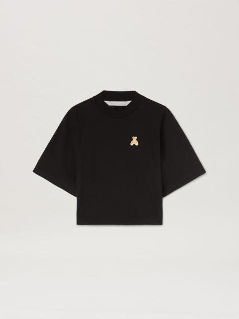 The evolution of a signature character: the teddy bear has an updated status and a matching quote. Women's black short-sleeved cropped T-shirt with mini teddy bear embroidered on front. LAURE WEARS SIZE S HEIGHT: 5' 9" (177 CM) BUST: 30" (78 CM) WAIST: 23" (60 CM) HIPS: 35" (87 CM) PRODUCT ID: PWAA020F24JER0091060