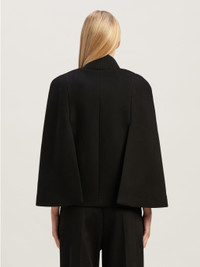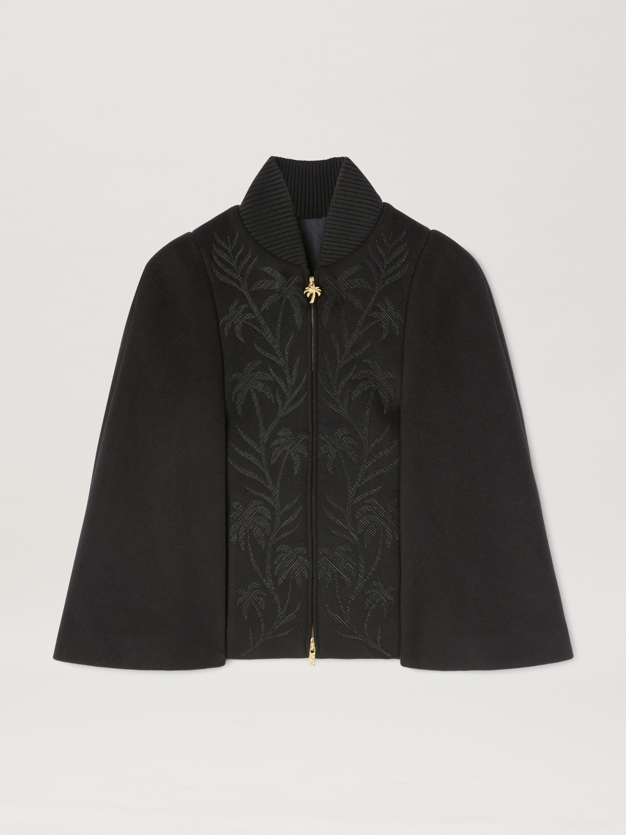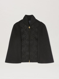 The finishing touch to add to an outfit for the event season. Women's short black cape, with ribbed collar, closed by golden zip with palm-shaped zip puller, front with devoré-effect palm pattern and wide sleeves. FABRIC 80% VIRGIN WOOL, 20% POLYAMIDE LINING 100% CUPRO MODEL EBBA WEARS SIZE 40 HEIGHT: 5’1” (178 CM) CHEST: 30’’ (78 CM) WAIST: 23’’ (58 CM) HIPS: 35” (89 CM) PRODUCT ID: PWEE002F23FAB0011010