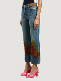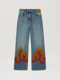 LONG FLARE DENIM PANTS WITH RED BURNING FLAMES GRAPHIC PRINTED AT BOTTOM. BROWN PATCH WITH PALM ANGELS LOGO PRINT SEWN AT FRONT. BUTTON CLOSURE AND REGULAR FIT. FABRIC 100% COTTON - LINING 35% COTTON 65% POLYESTER - DETAIL 100% LEATHER MODEL LARISSA WEARS SIZE 26 HEIGHT: 5’8” (179 CM) CHEST: 31.8” (81 CM) WAIST: 23.6” (60 CM) HIPS: 35” (89 CM) PRODUCT ID: PWYA026F22DEN0014025