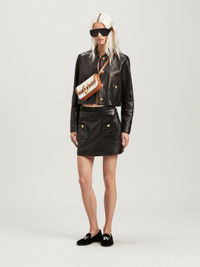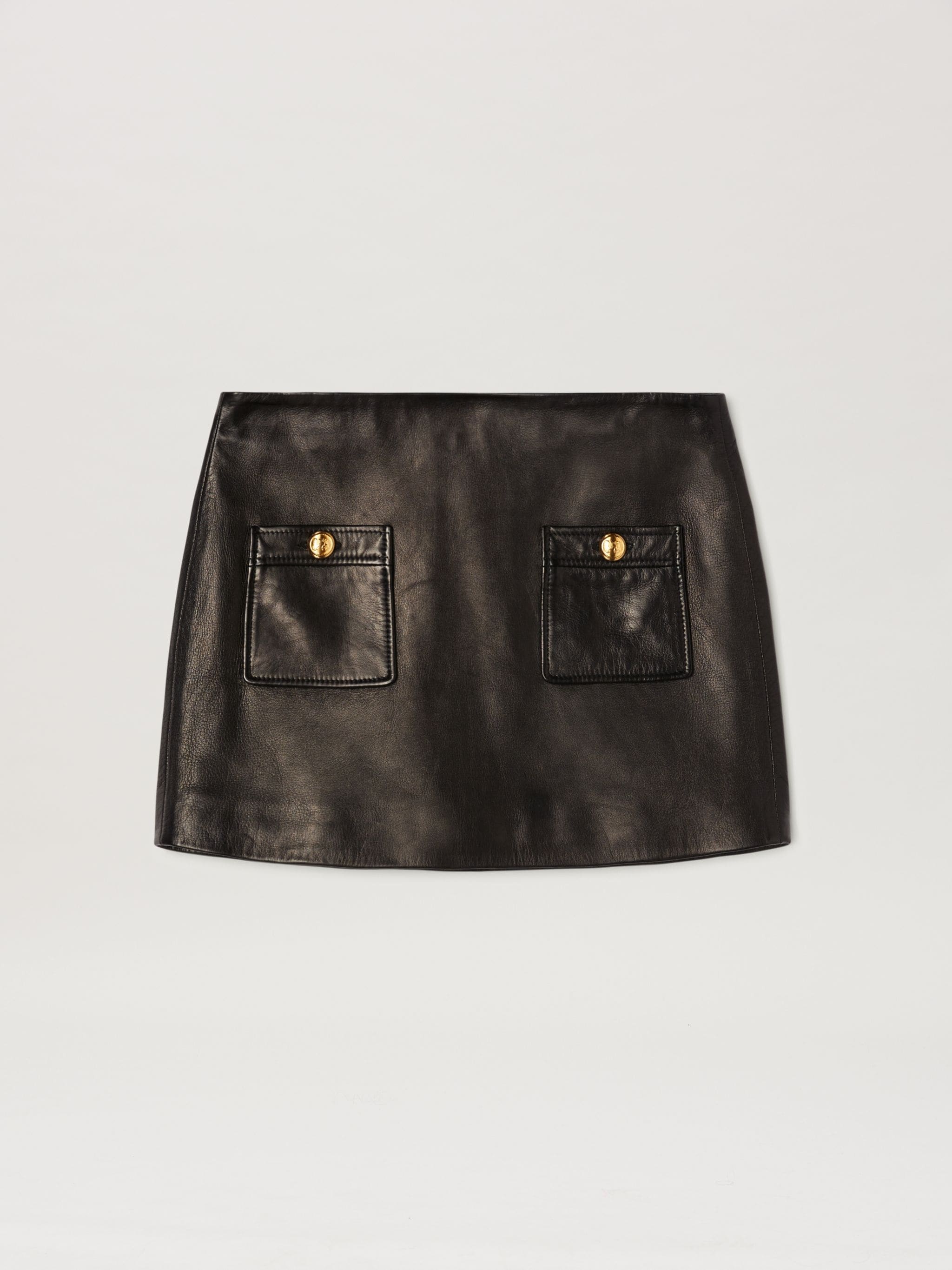 Low-waisted women's black leather miniskirt with back zip and small pockets with golden buttons engraved palm tree on the front. FABRIC 100% LEATHER LINING 1 100% CUPRO LINING 2 100% COTTON MODEL ERIKA WEARS SIZE 40 HEIGHT: 5'7" (175 CM) BUST: 31" (79 CM) WAIST: 23" (58 CM) HIPS: 34" (86 CM) PRODUCT ID: PWJC008F23LEA0011076