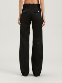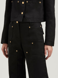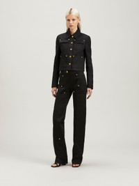 A versatile and timeless piece, perfect with everything. Fitted black women's pants with high waist, wide pockets and patch pockets on front and fastened with gold rivets, gold button closure. On the back, flap pockets with gold metal buttons. FABRIC 100% COTTON - LINING 100% CUPRO MODEL GABRIELLY WEARS SIZE 40 HEIGHT: 5’9" (179 CM) BUST: 31" (80 CM) WAIST: 24" (63 CM) HIPS: 35" (89 CM) PRODUCT ID: PWCF010F23FAB0011010
