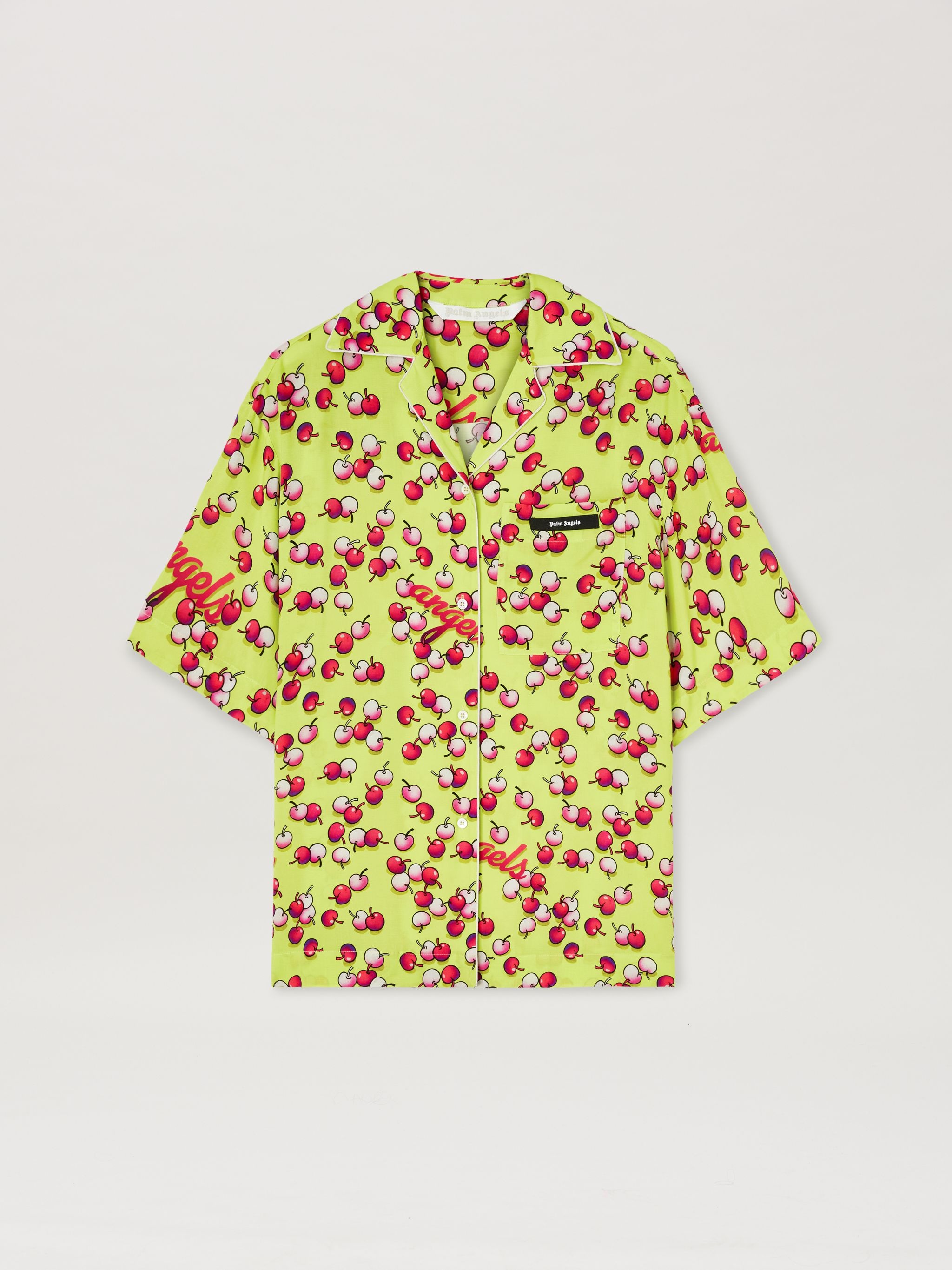 Exuberant prints to give a new seasonal flavor to the basics. Women's bowling style shirt with fuchsia cherry pattern on lime green background, Palm Angels pop up lettering and black tape with white printed logo on front pocket. DETAIL 100% ACETATE - FABRIC 100% VISCOSE Ebba wears size 40 Height: 5' 10" (178 cm) Bust: 31" (79 cm) Waist: 23" (60 cm) Hips: 35" (89 cm) PRODUCT ID: PWGG005F24FAB0015432