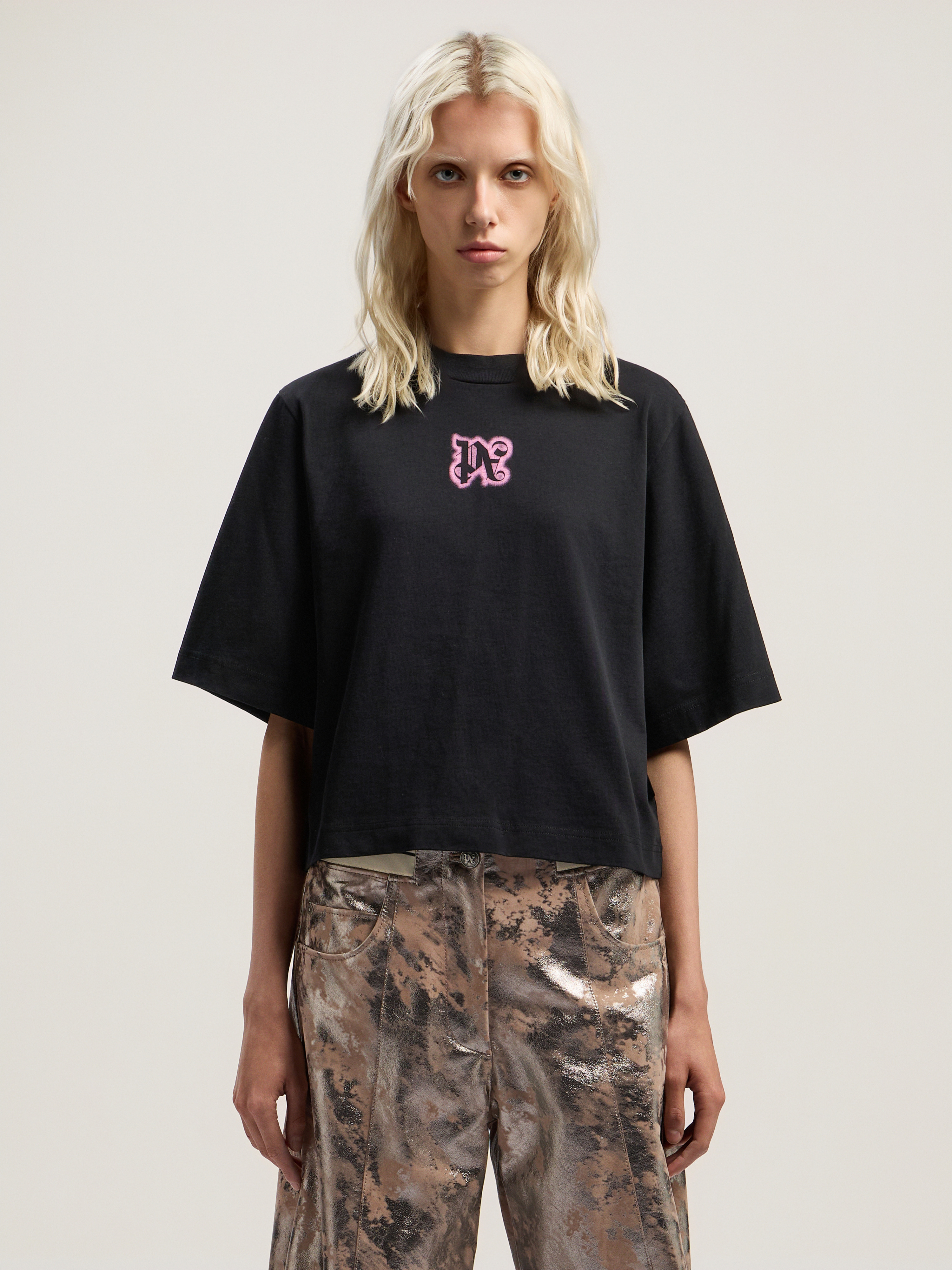 This cropped tee merges classic streetwear aesthetics with a bold logo design, crafted from high-quality cotton for a relaxed fit. - Soft cotton construction - Cropped silhouette - Bold logo on front and back - Relaxed fit with dropped shoulders - Ribbed crew neckline - Short sleeves for casual styling - Signature logo motif at rear DETAILS - 100% Cotton, Rib detail: 100% Cotton - Code: PWAA079F25JER0031030