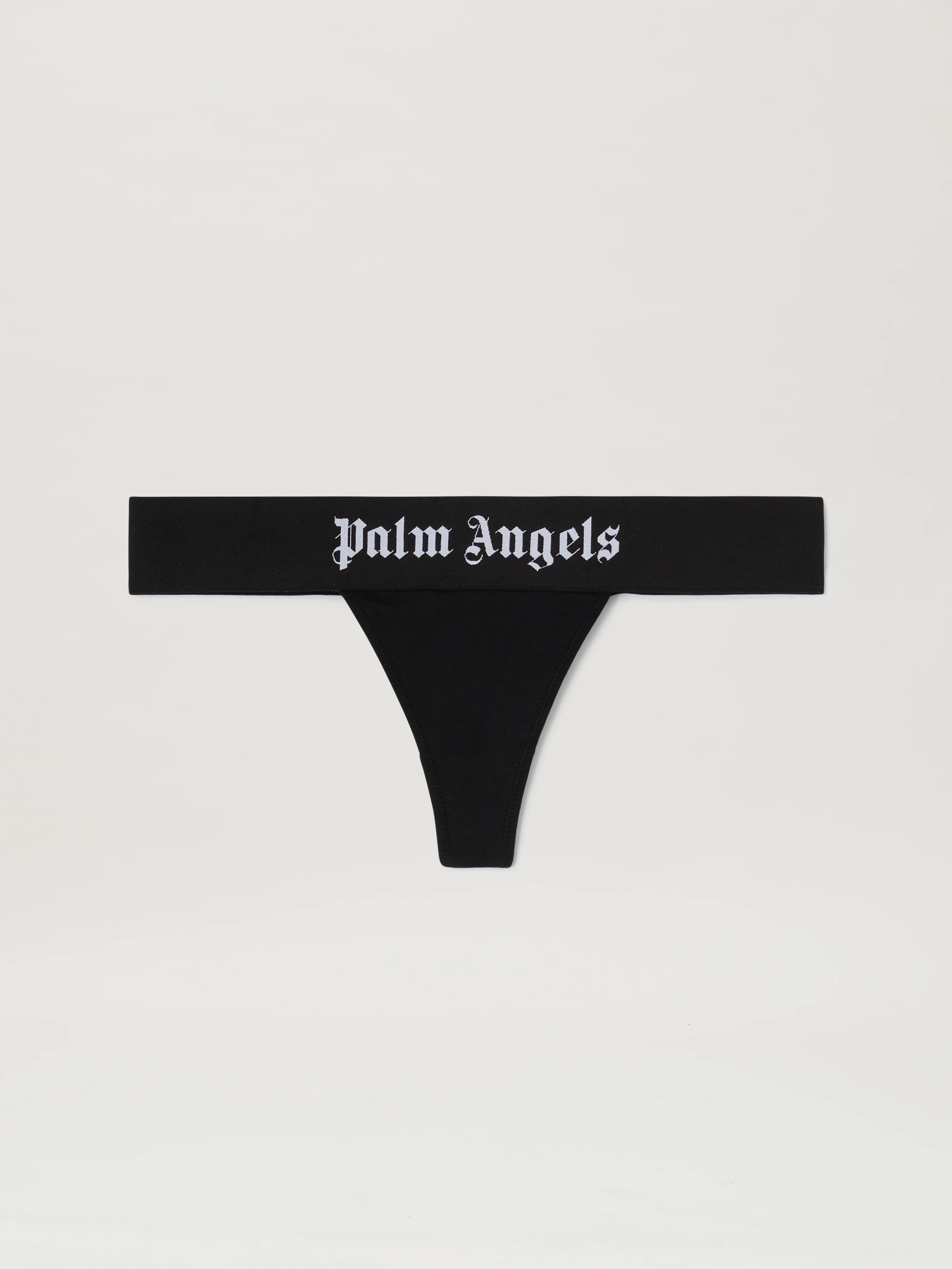Essential and highly recognizable. Women's black thong with black elastic band and white Palm Angels logo on front. DETAILS - Detail 82% Polyester 9% Elastan 9% Polyamide - Fabric 6% Elastan 94% Cotton - Code: PWUF001C99FAB0031010