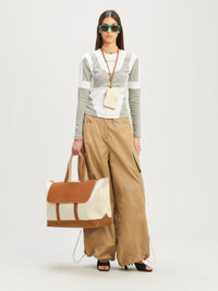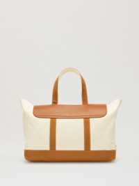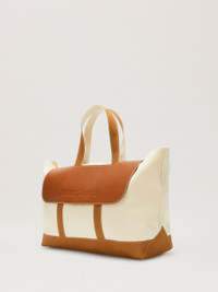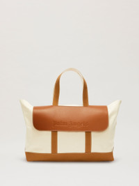 White canva cotton maxi tote bag, for travel or work, with leather bottom, paired leather straps and hammered leather top with engraved Palm Angels logo. FABRIC 1 100% COTTON FABRIC 2 100% CALF LEATHER FABRIC 3 60% COTTON 40% POLYAMIDE Height: 13" (33 cm) Length: 22.8" (58 cm) Depth: 7.1" (18 cm) PRODUCT ID: PMNA058E23FAB0020460