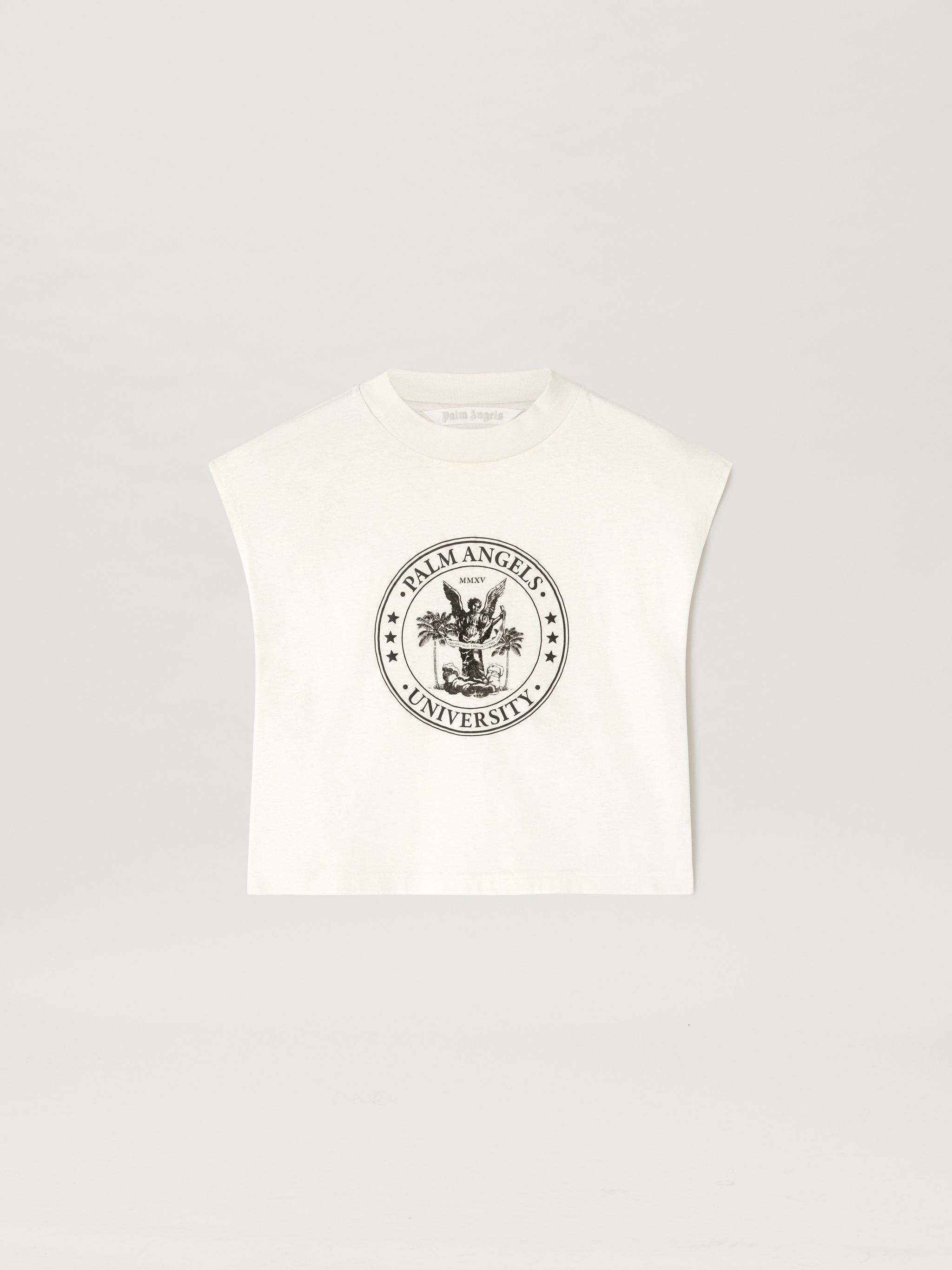 SLEEVELESS T-SHIRT IN WHITE COTTON JERSEY WITH "PALM ANGELS" COLLEGE LOGO PRINTED IN BLACK AT FRONT. CREW NECK COLLAR. FABRIC 100% COTTON MODEL IVANA WEARS SIZE S HEIGHT: 5’9" (179 CM) CHEST: 33” (85 CM) WAIST: 24” (61 CM) HIPS: 34” (87 CM) PRODUCT ID: PWAC011S23JER0050410
