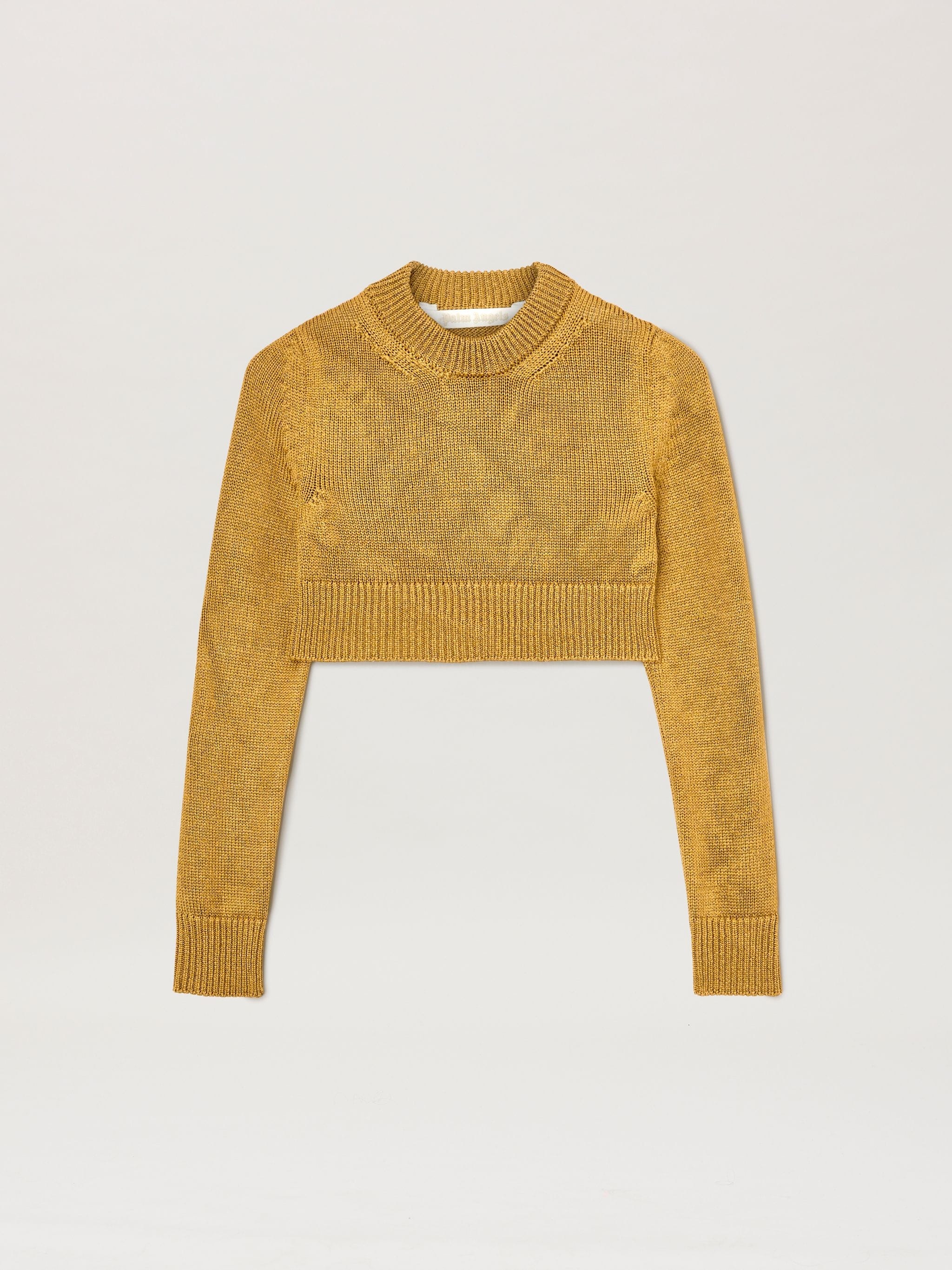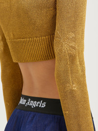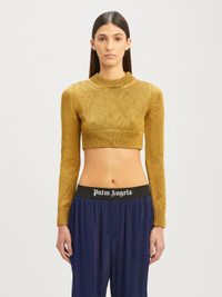 Gold laminated knited cropped top crew neck, long sleeves and palm tree silhouettes on elbow and back sleeve, with ribbed collar, cuffs and hem. FABRIC 100% POLYESTER EMBROIDERY 100% POLYESTER MODEL GABRIELLY WEARS SIZE S HEIGHT: 5’9" (179 CM) BUST: 31" (80 CM) WAIST: 24" (63 CM) HIPS: 35" (89 CM) PRODUCT ID: PWHE050E23KNI0017676