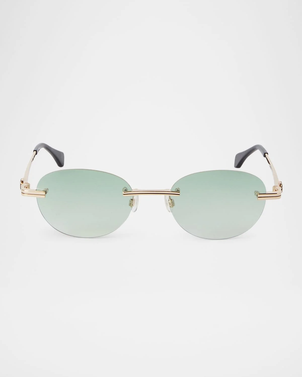 - Palm Angels "Crystal" rimmed oval sunglasses in metal - Eye/bridge/temple (in mm): 56-19-145 - Gradient lenses - Adjustable nose pads - Thin, tapered arms - Capped earpieces - Gold-tone logo monogram at temples - Metal - 100% UVA/UVB protection - Made in Italy - Proposition 65 warning for California residents