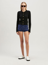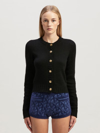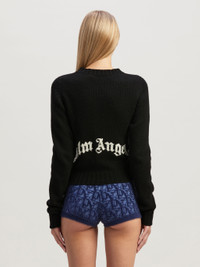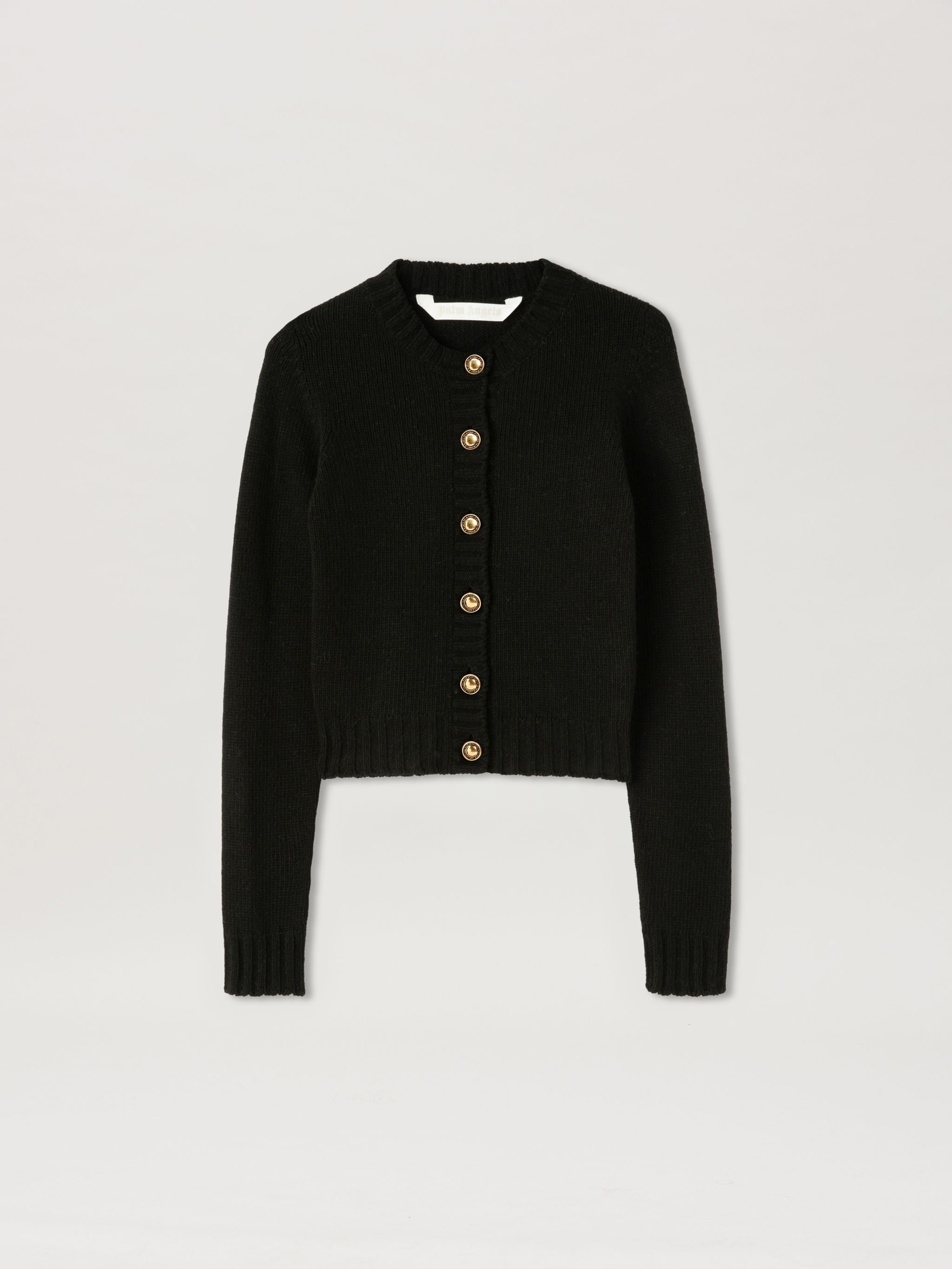 A street and chic take on knit. Women's black short waist knit cardigan with round neckline, ribbed collar, cuffs, hem, and placket, gold logo button closure, and white embroidered Palm Angels curved logo on back. Ebba wears size 40 Height: 5' 10" (178 cm) Bust: 31" (79 cm) Waist: 23" (60 cm) Hips: 35" (89 cm) PRODUCT ID: PWHB020C99KNI0011001