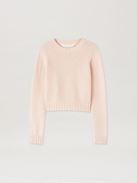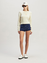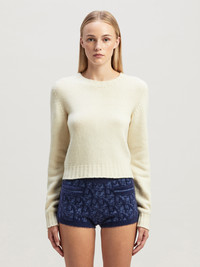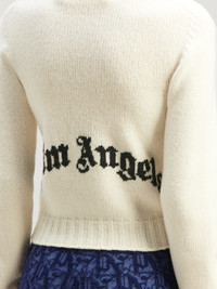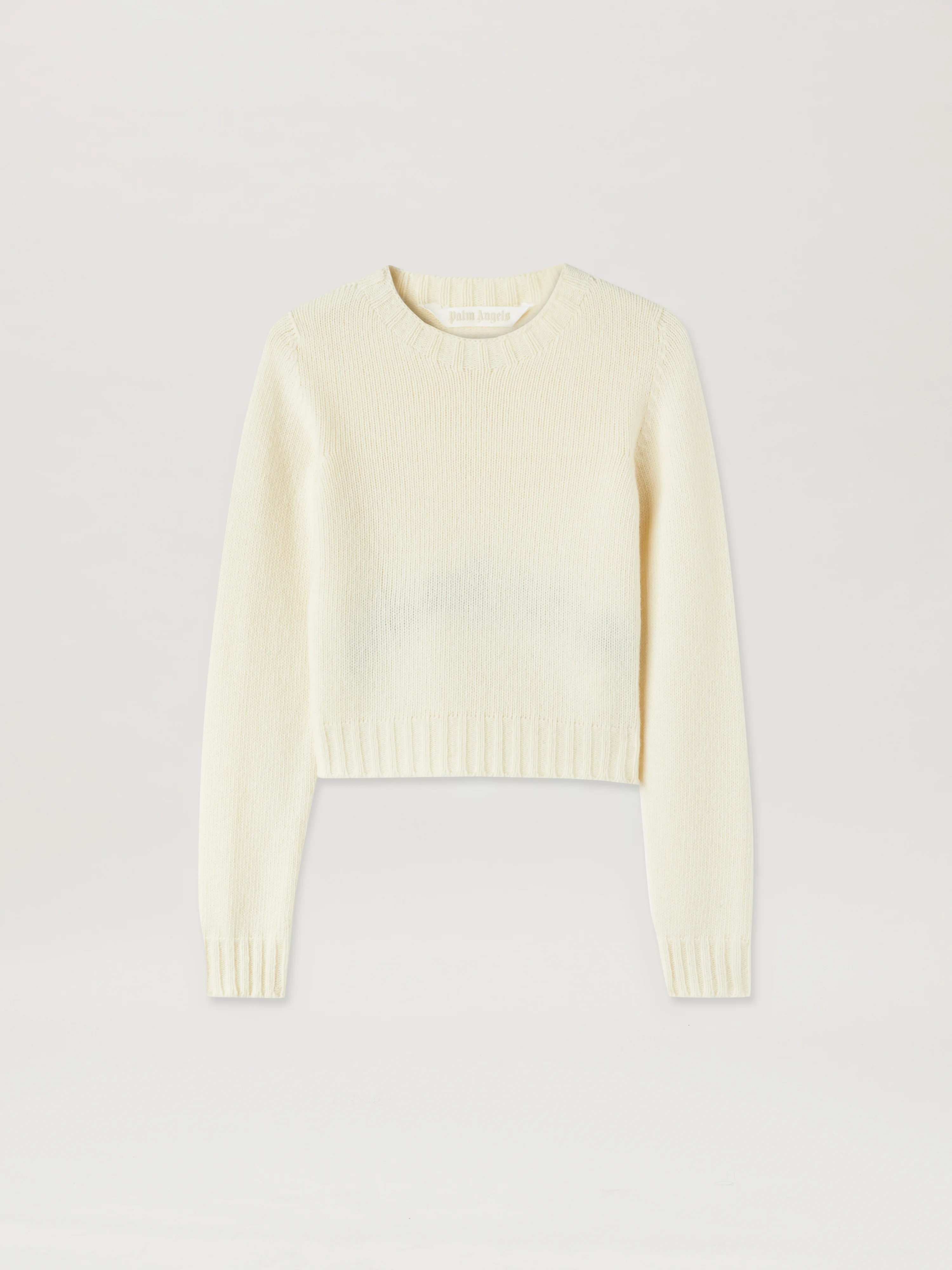 A street and chic take on knit. Women's white crew-neck knit sweater with short waist, ribbed cuffs, collar and hem and with Palm Angels curved logo embroidered in black on back. Ebba wears size 40 Height: 5' 10" (178 cm) Bust: 31" (79 cm) Waist: 23" (60 cm) Hips: 35" (89 cm) PRODUCT ID: PWHE051C99KNI0010310