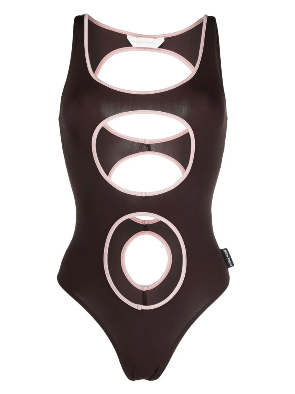 cut-out swimsuit In line with its playful and irreverent spirit, Palm Angels adorns this brown swimsuit with large circular cut-outs to the front and back, creating a skin-baring, bold quality that lends itself to warm summery weather. Highlights - Cedar brown/light pink - Cut-out detailing - Stretch-design - Square neck - Pull-on style - Wide shoulder straps - High cut - Be mindful to try on swimwear over your own garments. Made in Italy Composition Outer: Polyamide 59%, Elastane 41% Lining: Polyester 88%, Elastane 12% Washing instructions Machine Wash
