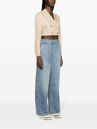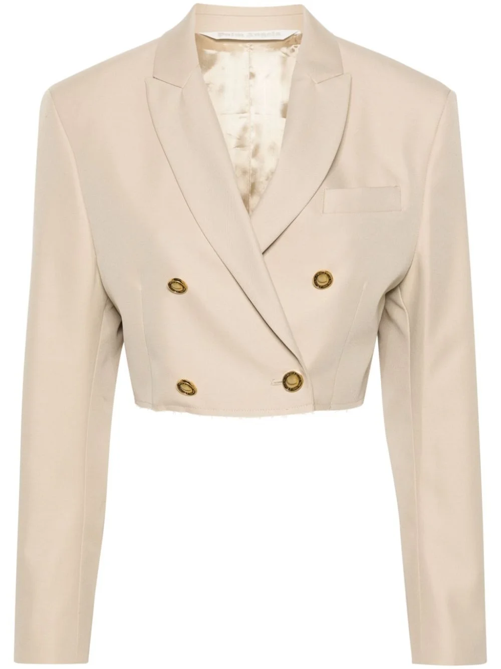 double-breasted cropped blazer Palm Angels tailors the traditional single-breasted blazer to a contemporary, cropped profile. This beige garment combines classic elements such as notched lapels with a raw-cut hem for a modern take on a classic style. Highlights - Beige - Twill weave - Peak lapels - Double-breasted button fastening - Shoulder pads - Buttoned cuffs - Chest welt pocket - Cropped straight hem - Satin lining Made in Italy Composition Outer: Polyester 65%, Cotton 35% Lining: Viscose 100% SIZE & FIT Model measurements Height 5 ft 11 in(1.8 m) Bust/Chest 34.25 in(87 cm) Hips 35.82 in(91 cm) Waist 24.8 in(63 cm) Measurement LENGTH 15.94 in(40.5 cm) BUST 37 in(94 cm) FittingInformation Designed for a relaxed fit, this piece allows for comfort and movement when worn The internal shoulder pads offer a structured shape Made from a midweight non-stretch fabric This piece fits true to size – take your usual size Washing instructions Machine Wash