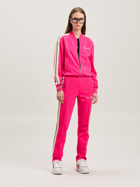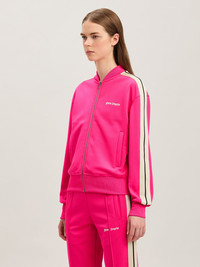 Palm Angels is a state of mind, the tracksuit its daily outfit. Women's fuchsia bomber-style track jacket with ribbed round collar, iconic Tape on the sleeves, and Palm Angels logo embroidered in white on the front. TILDA WEARS SIZE S HEIGHT: 5’ 10” (178 CM) BUST: 28” (73 CM) WAIST: 23” (60 CM) HIPS: 35" (89 CM) PRODUCT ID: PWBD050S25FAB0023203