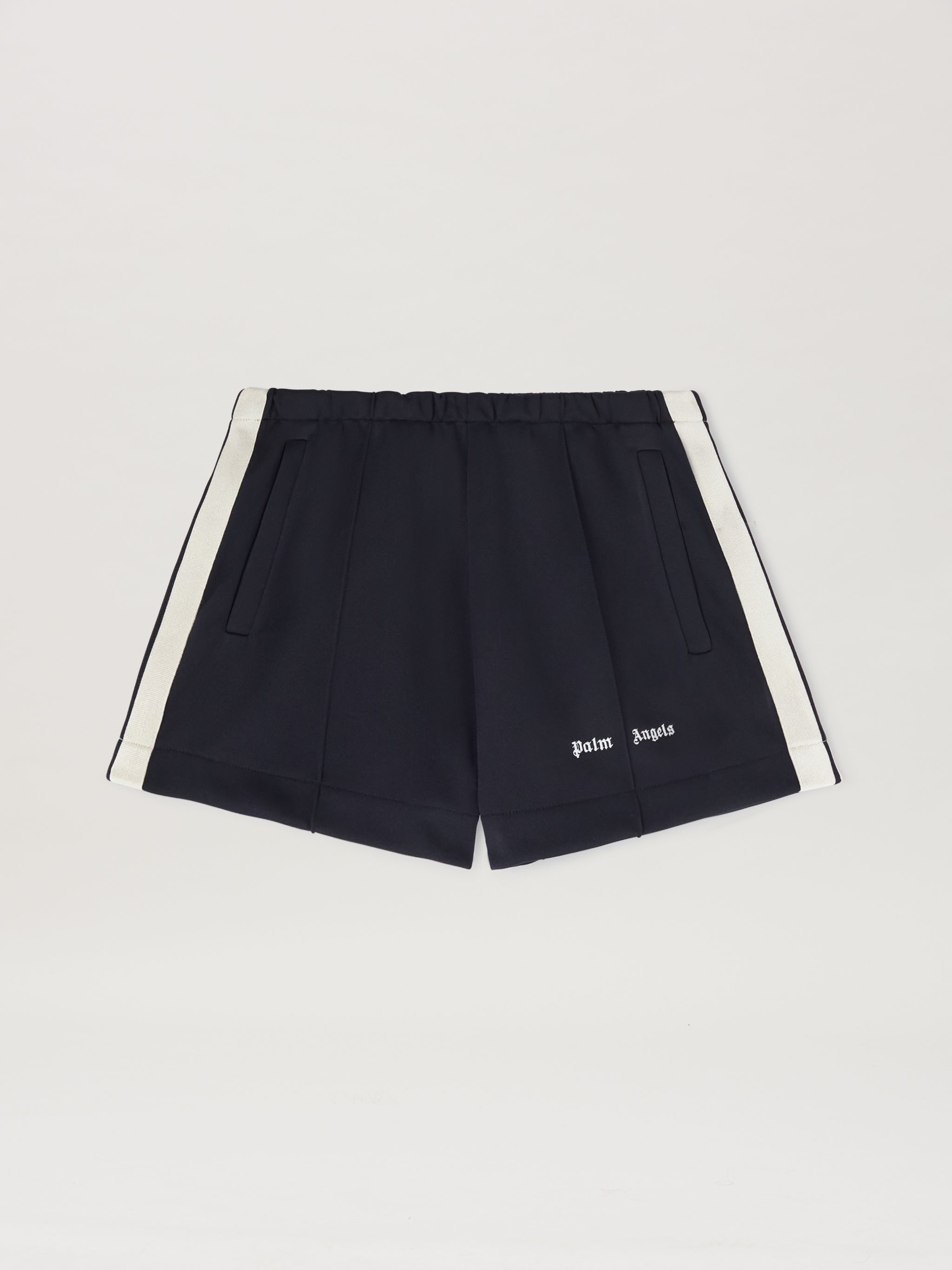 Palm Angels is a state of mind, the tracksuit its daily outfit. Women's black track shorts with elastic waist, iconic Tape on the sides, and Palm Angels logo embroidered in white on the front. PRODUCT ID: PWCL005C99FAB0021003