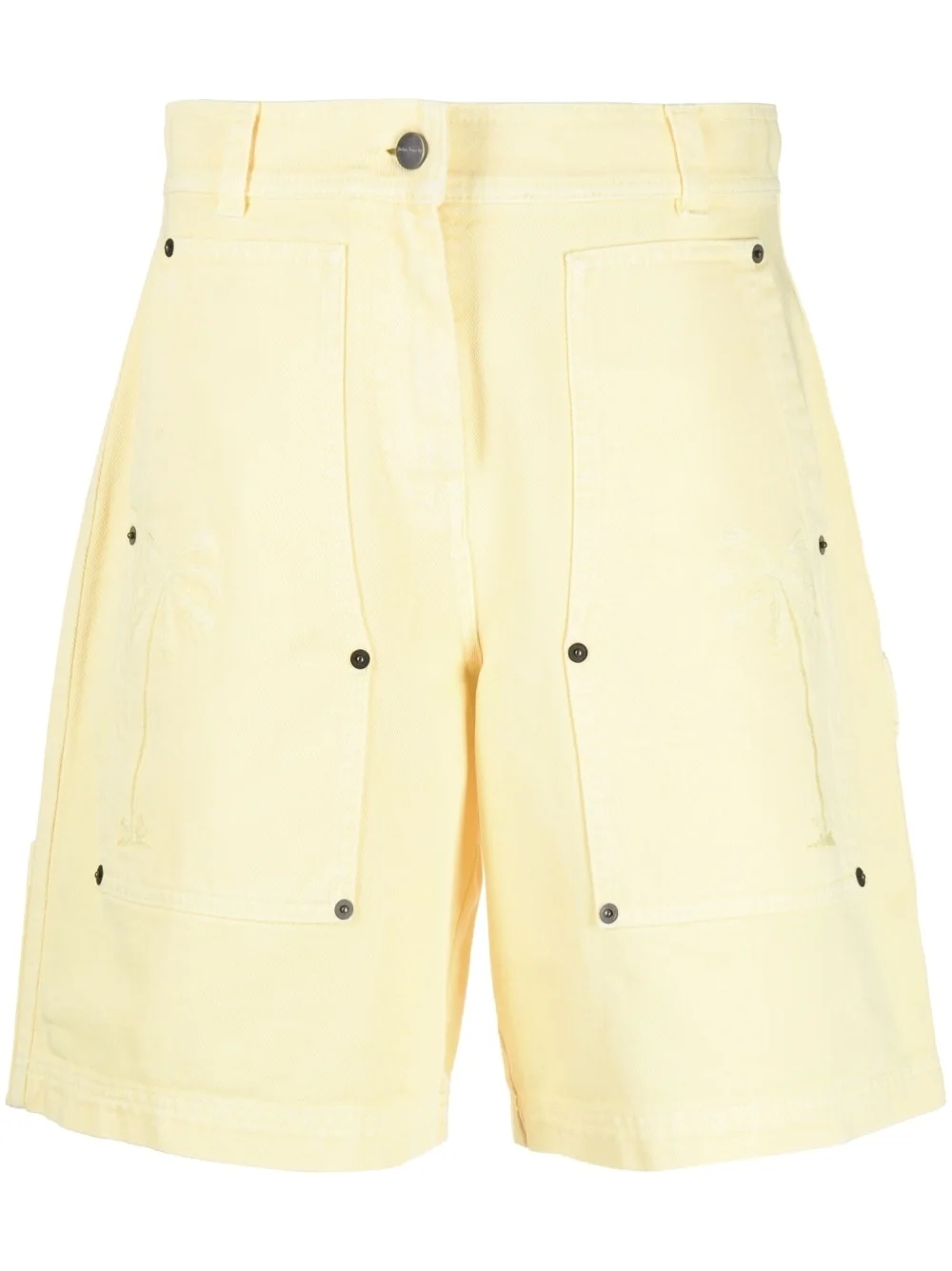 embroidered palm tree shorts Made in Italy, these pastel yellow shorts from Palm Angels sit high at the waist for an elongating silhouette and tap into the brand's Californian roots thanks to tonal embroidered palm trees at the sides. Made in Italy Composition Cotton 100% SIZE & FIT Model measurements Height 5 ft 10 in(1.79 m) Bust/Chest 31.1 in(79 cm) Hips 35.03 in(89 cm) Waist 24.01 in(61 cm) FittingInformation Designed for a loose fit, offering comfort and movement when worn Sturdy and hard-wearing, this denim piece offers no stretch This piece fits true to size – take your usual size Washing instructions Machine Wash