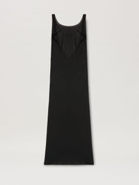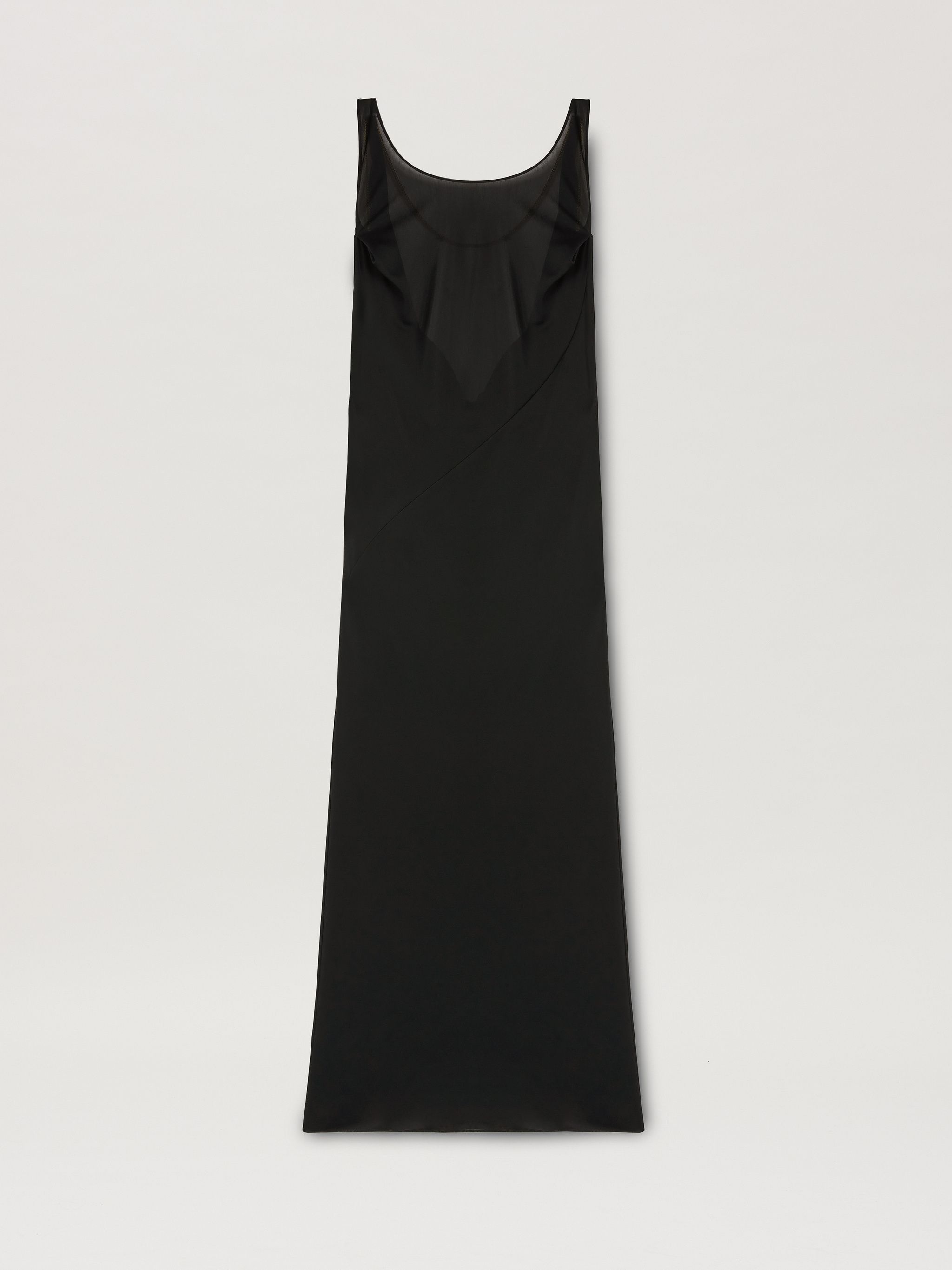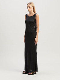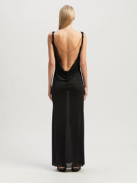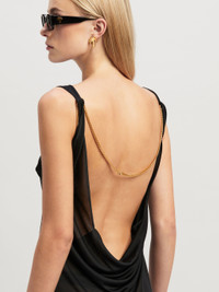 Time to dress up and going out. Women's long black evening dress with round neckline at front and side ruffling, deep neckline at back crossed with gold chain and draped at bottom. Ebba wears size 40 Height: 5' 10" (178 cm) Bust: 31" (79 cm) Waist: 23" (60 cm) Hips: 35" (89 cm) PRODUCT ID: PWDB213R24FAB0011010